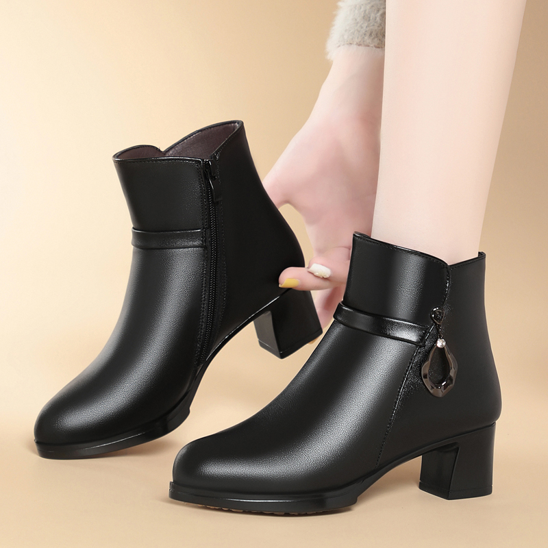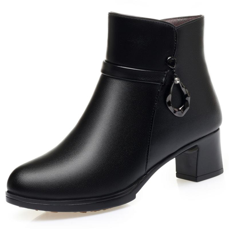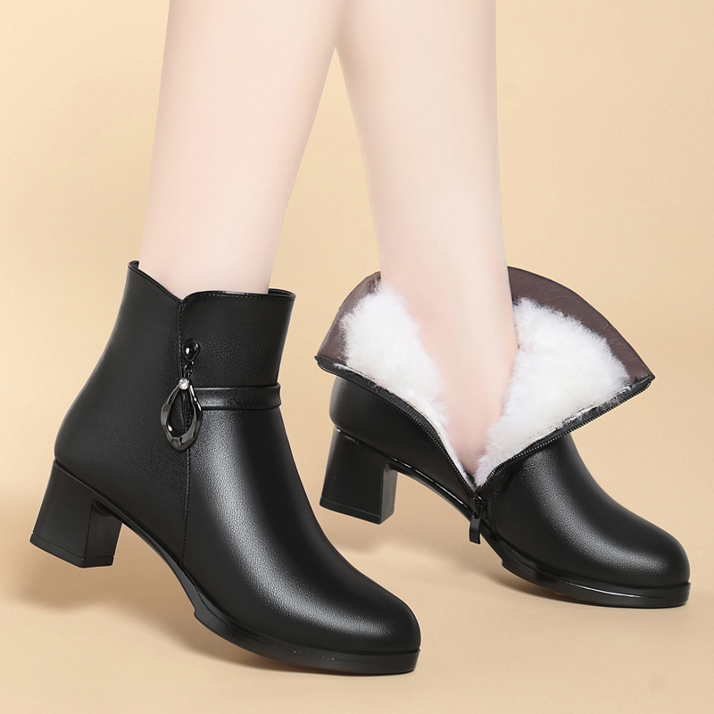 2025新款秋冬季短靴真皮加绒加厚羊毛女靴子中跟粗跟大码中年棉靴