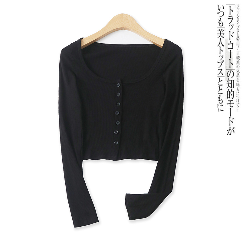 短开衫春秋季新款外贸女装百搭大U领单排扣修身长袖螺纹T恤16211