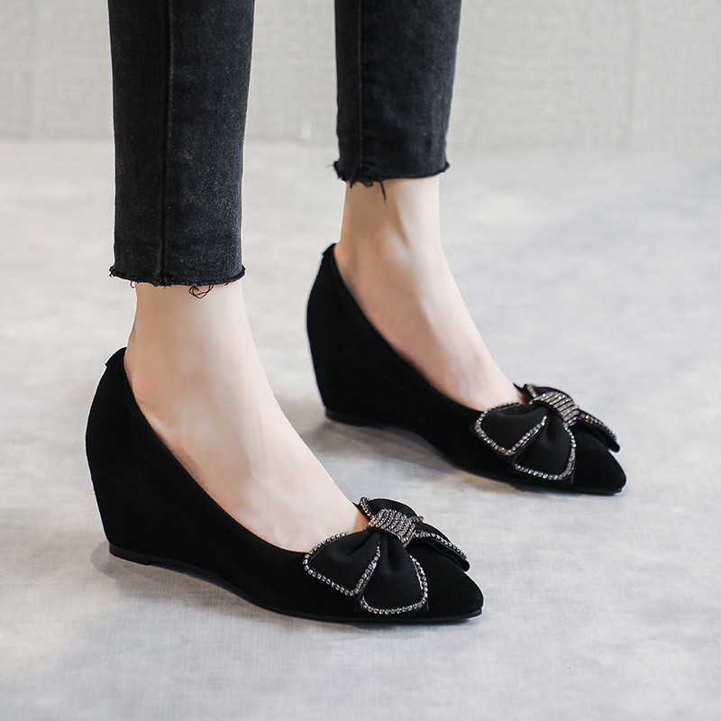 坡跟单鞋女秋2025年新款蝴蝶结浅口尖头内增高职业女鞋真皮豆豆鞋