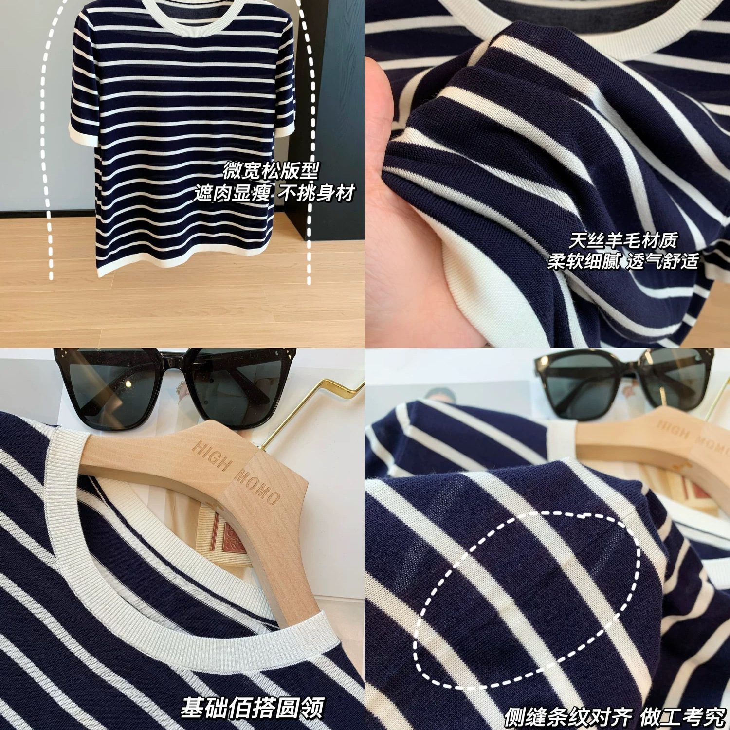 经典海魂衫轻薄透气天丝百搭圆领条纹短袖针织衫女宽松显瘦T恤衣