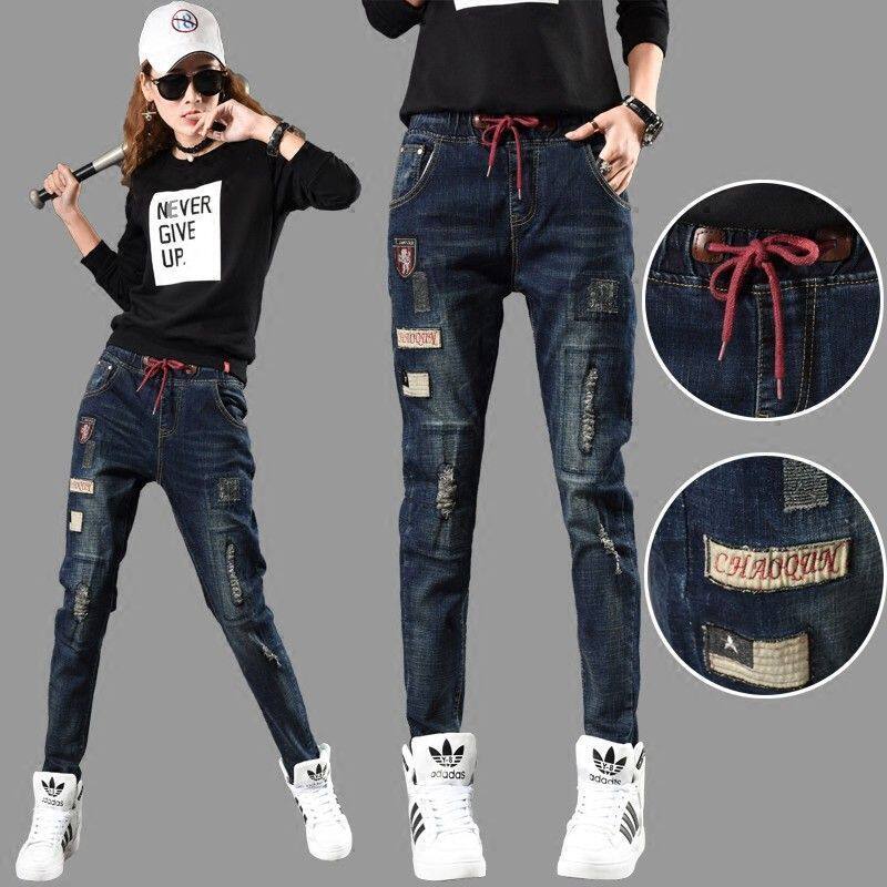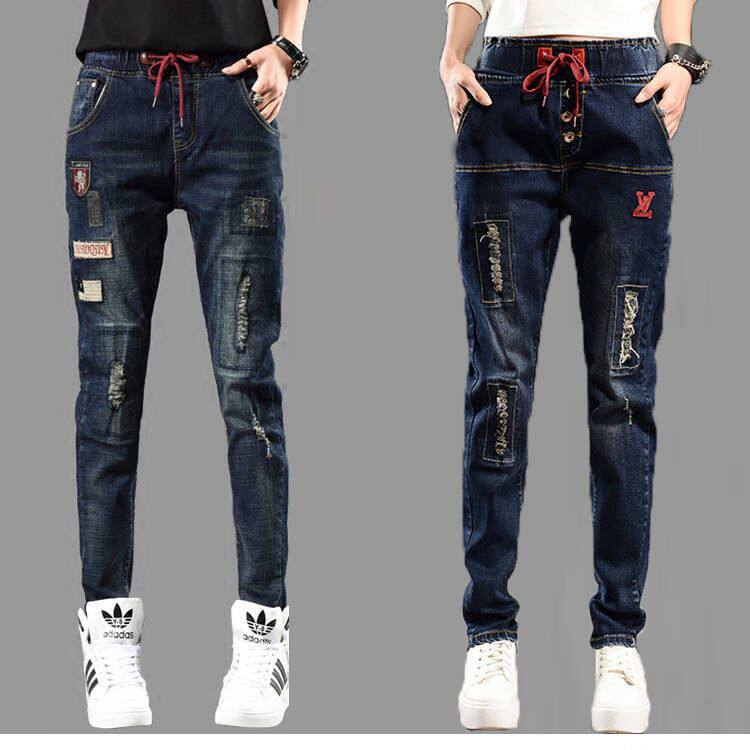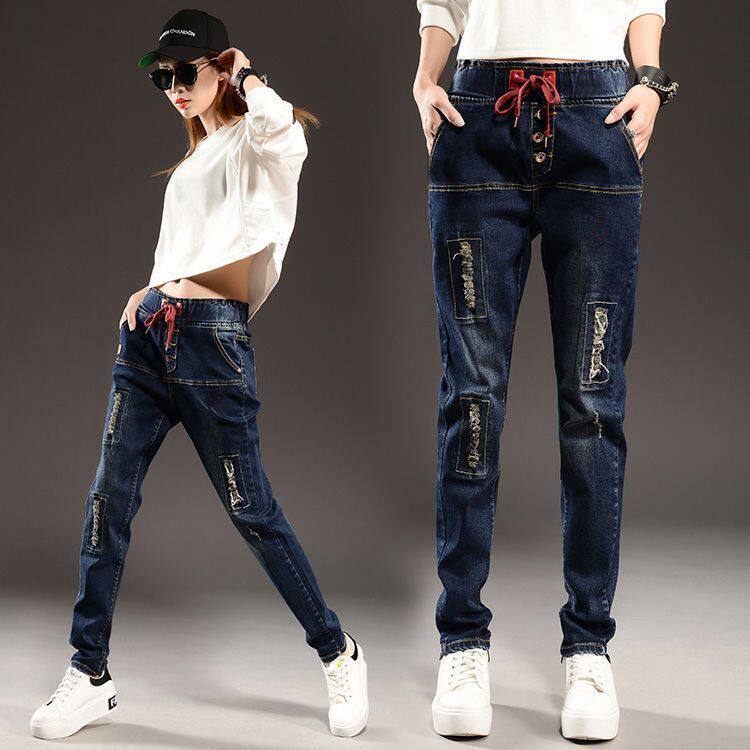 大码牛仔裤女长裤弹力宽松系带松紧腰小脚裤哈伦裤垮裤新款韩版新
