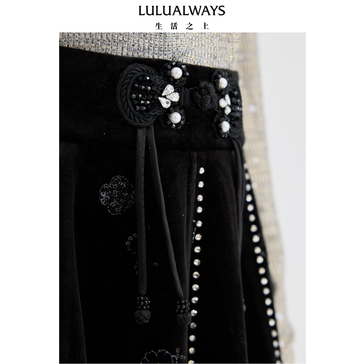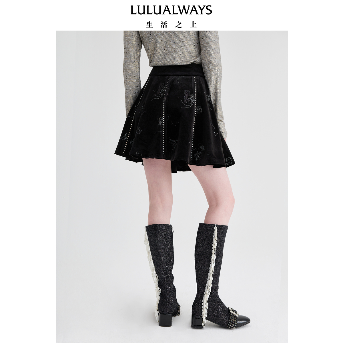 LULUALWAYS【商场同款】秋季新款时尚高腰伞裙绣花丝绒短半身裙