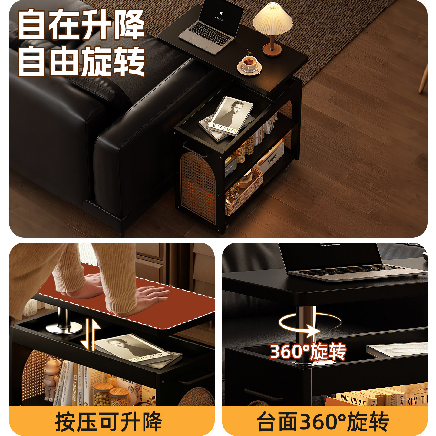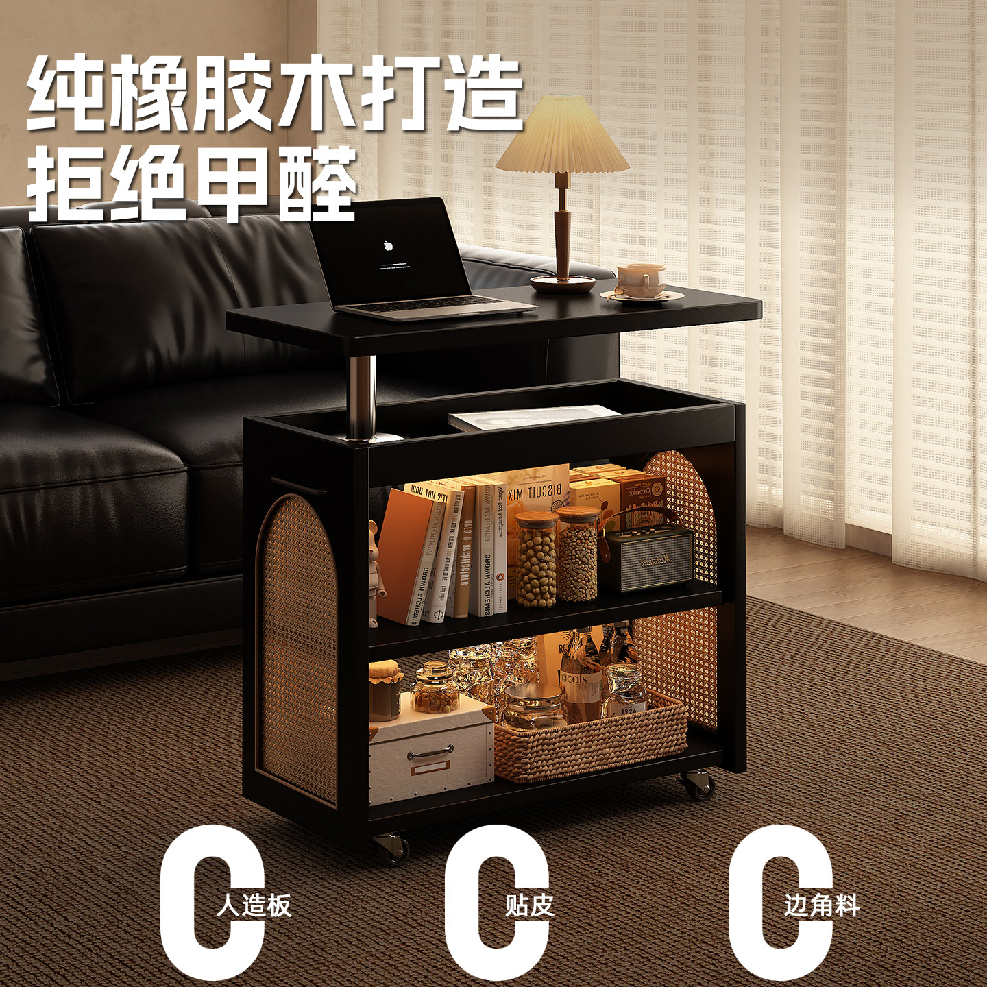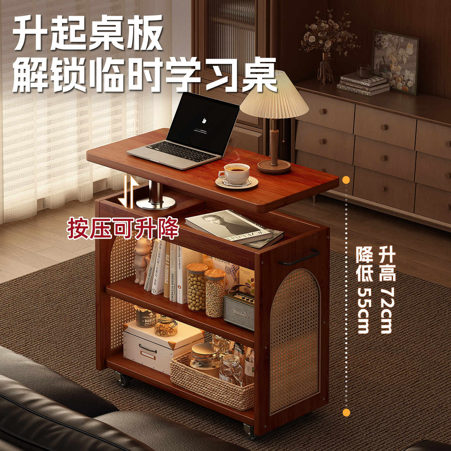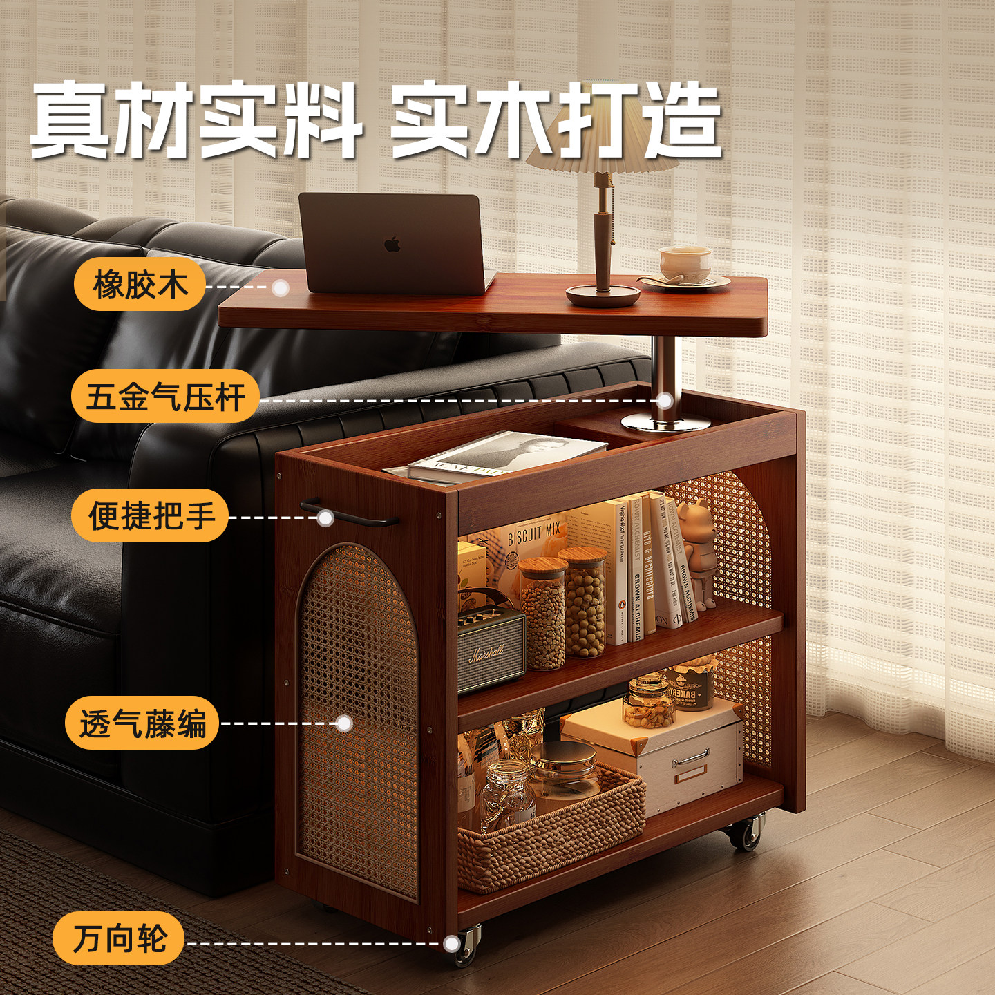 升降沙发边几小推车实木移动茶几小桌子置物架客厅中古风藤编餐车