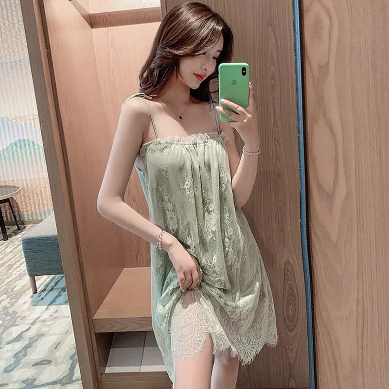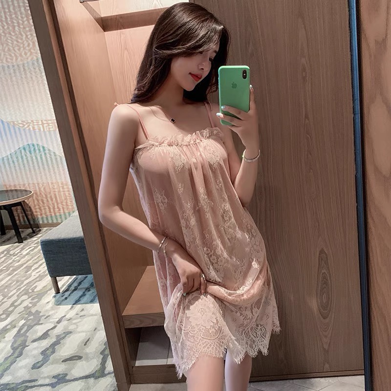 吊带睡裙女夏季睡衣冰丝绸性感黑色网纱大码蕾丝低胸裙子春家居服