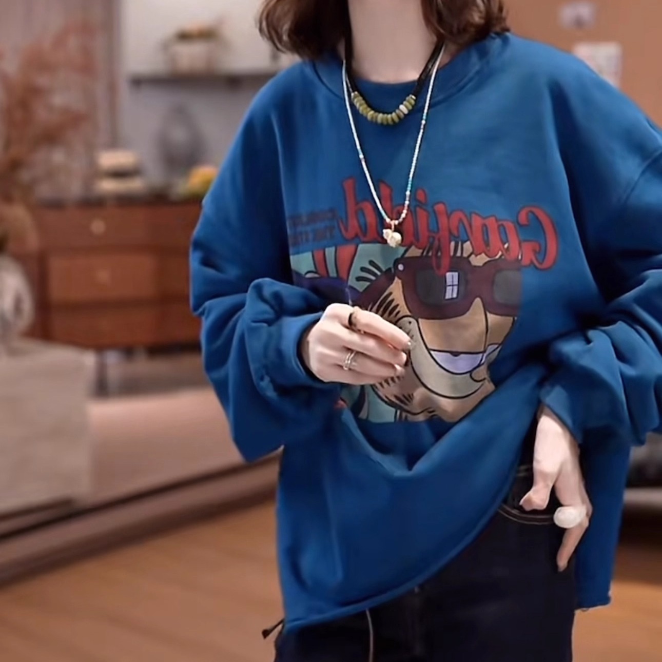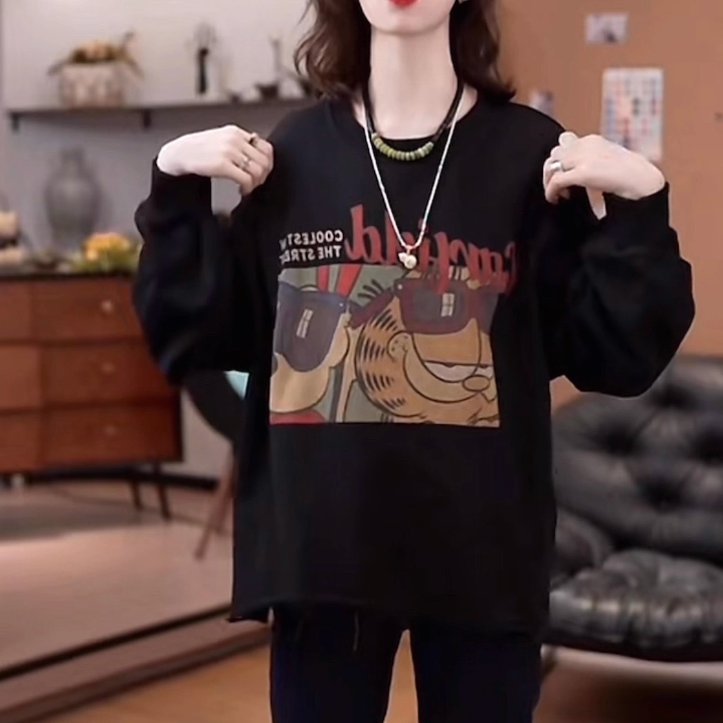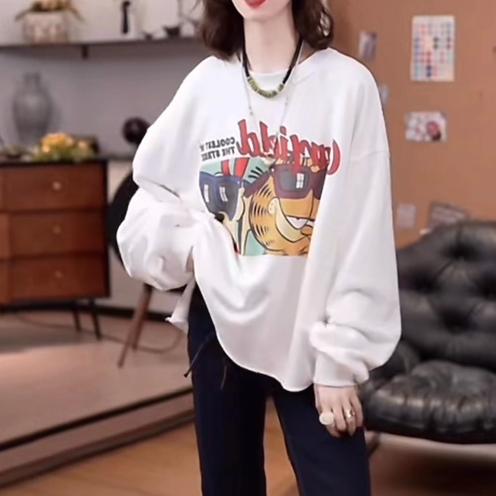 潮牌卡通加菲猫套头卫衣女2025秋季新款宽松百搭显瘦下摆开叉上衣