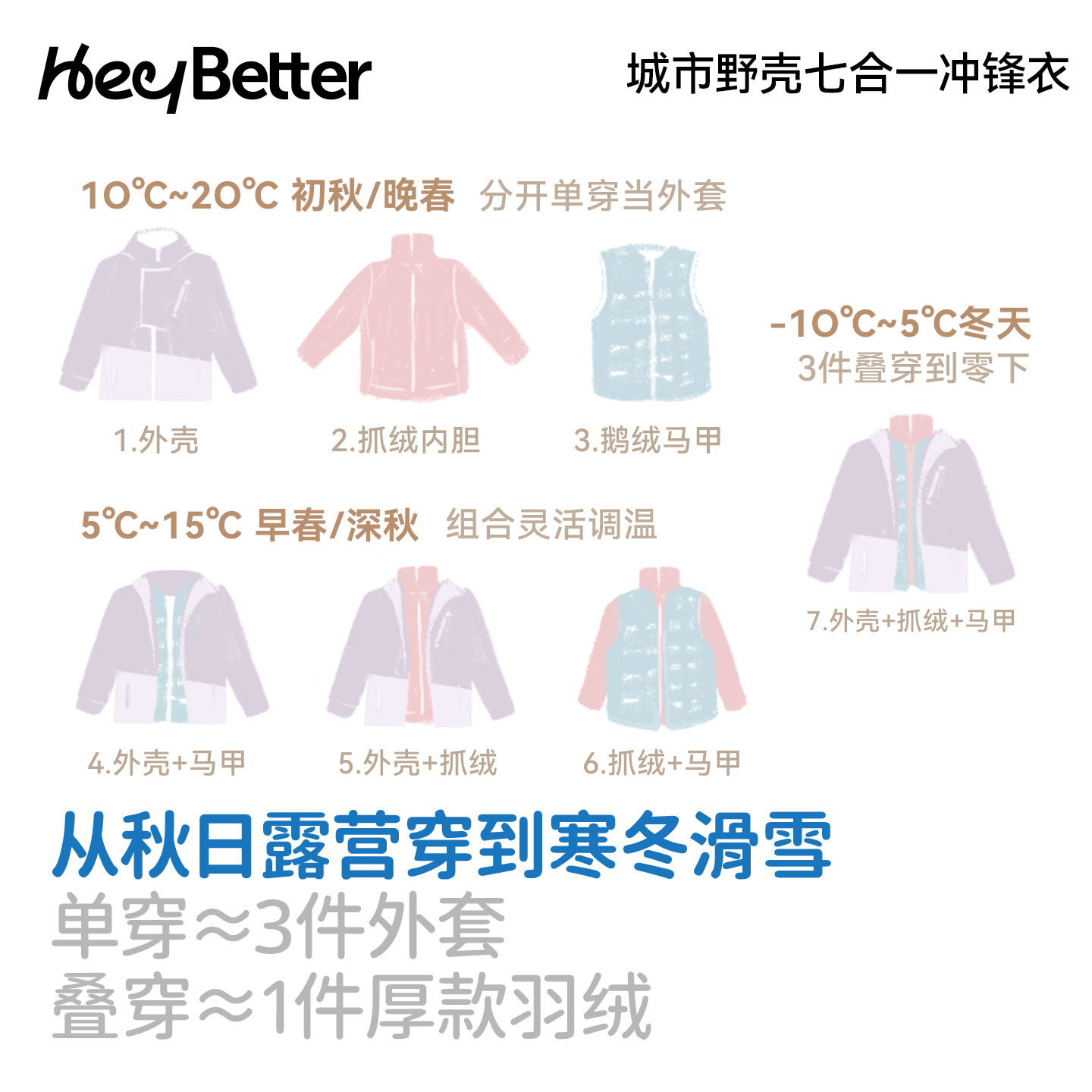 HeyBetter儿童冲锋衣七合一抓绒内胆防水防风防污男女童秋冬外套