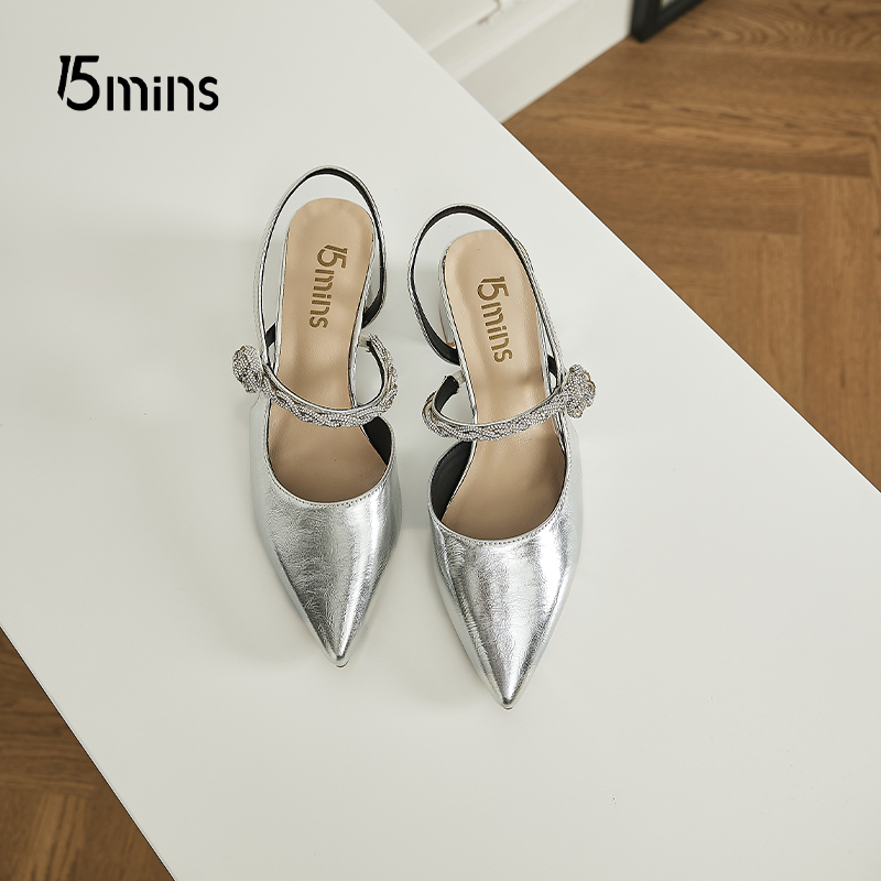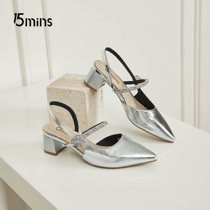 15mins粗跟包头凉鞋女夏外穿2025新款银色洋气法式凉鞋高跟凉拖鞋