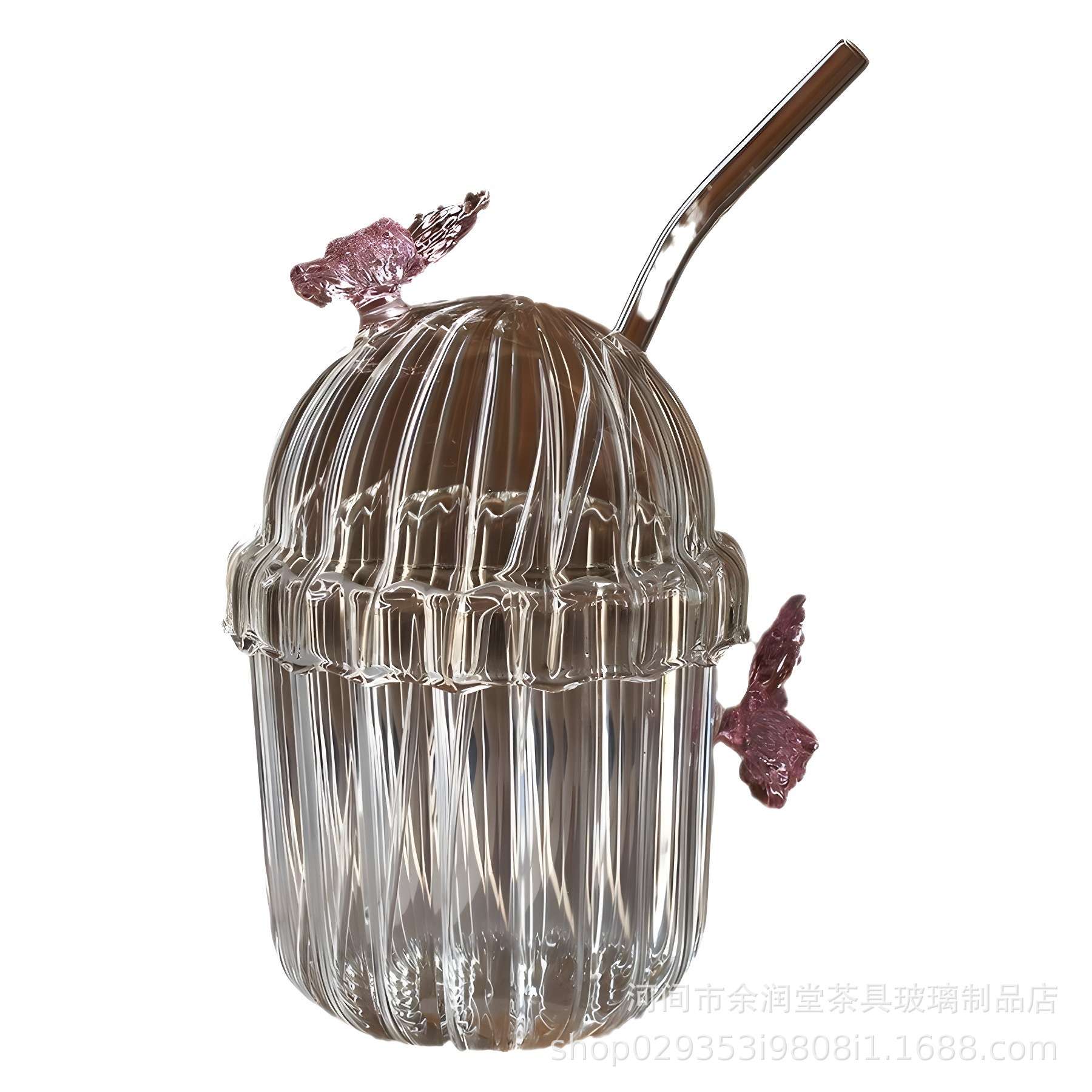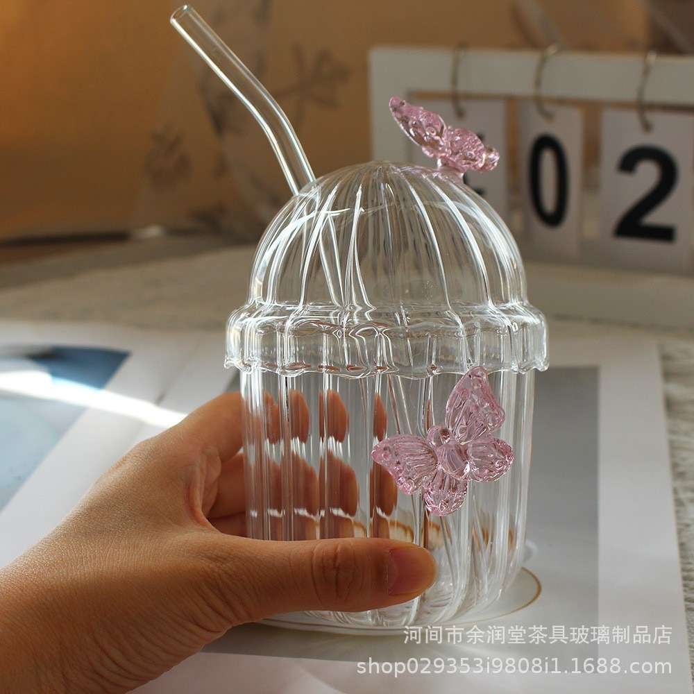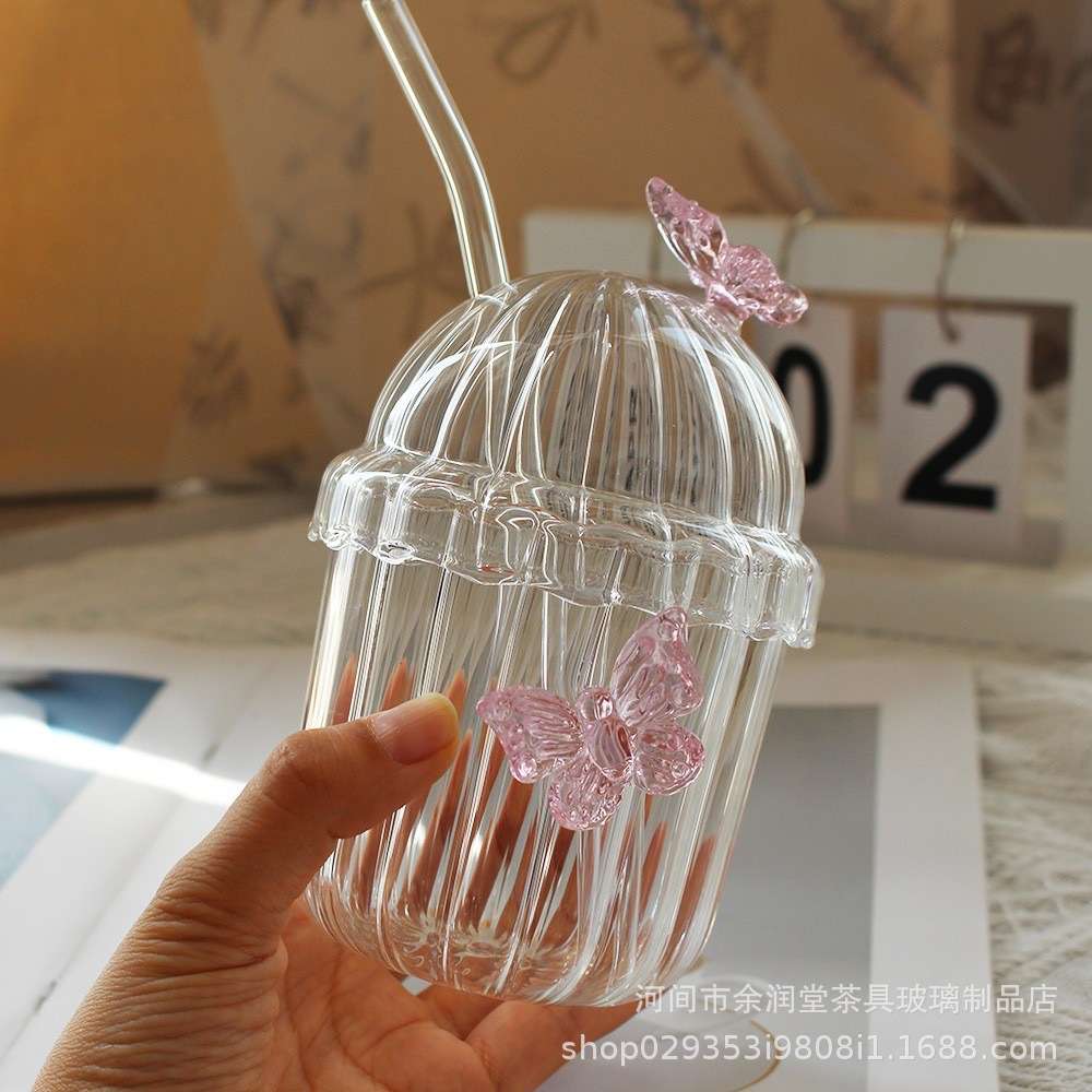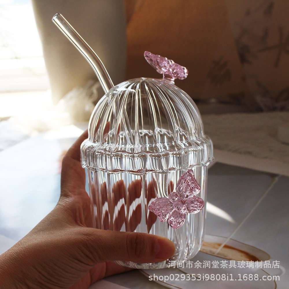 玻璃杯 创意高硼硅玻璃可爱蝴蝶结啵啵吸管杯 带盖条纹果汁单层杯