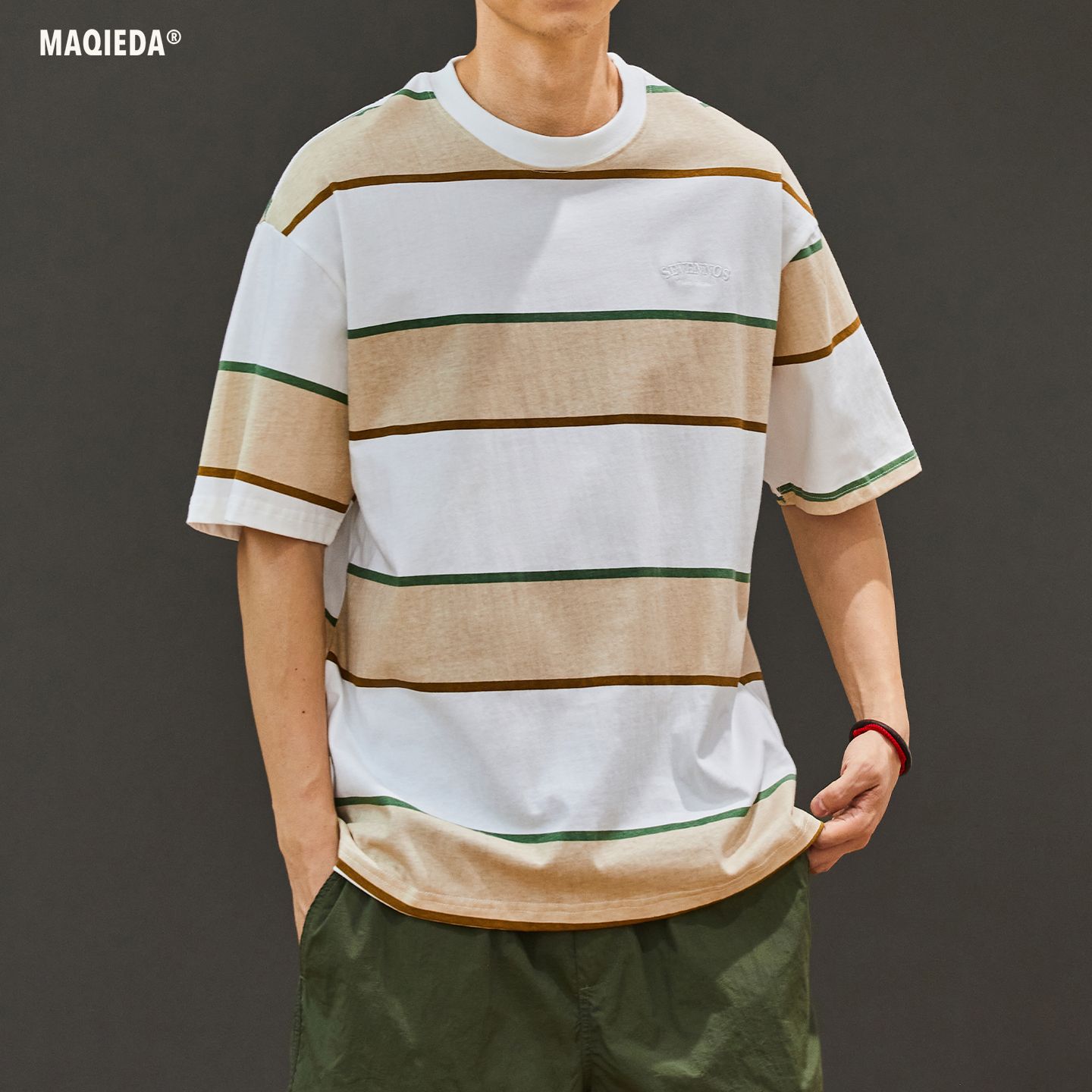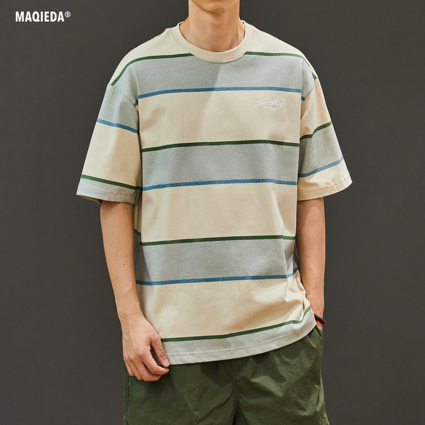 马切达夏季情侣小清新日系短袖条纹男士复古T恤学院风百搭上衣tee