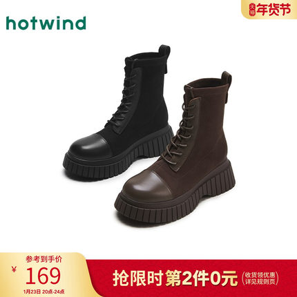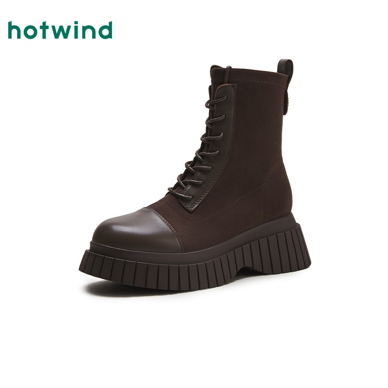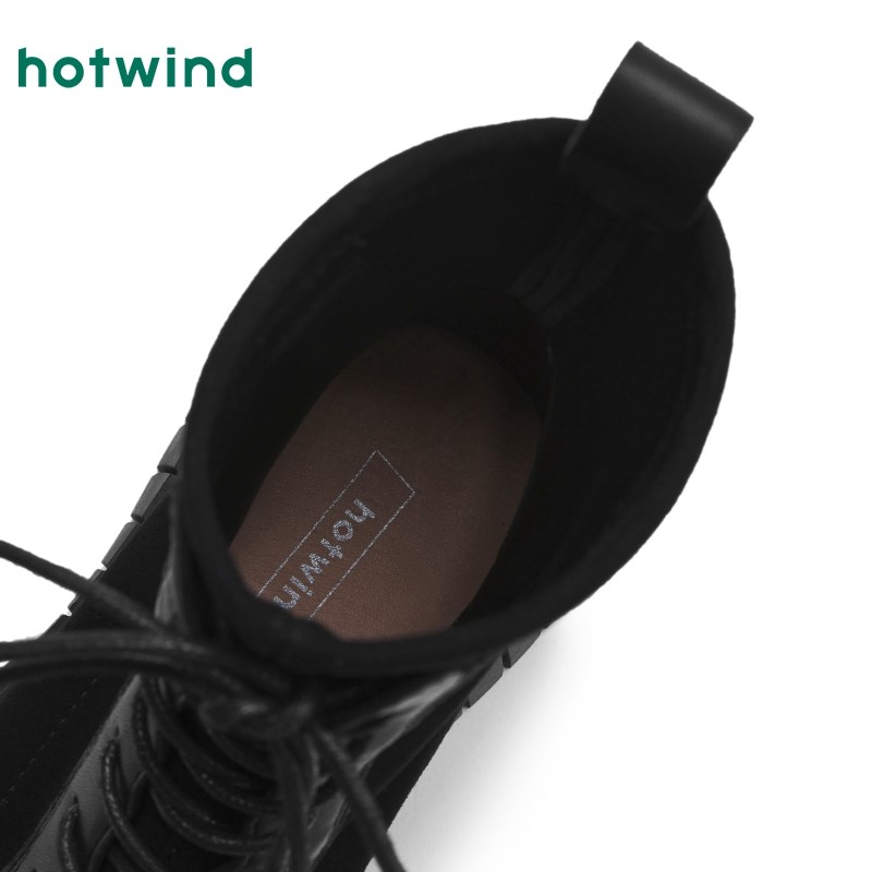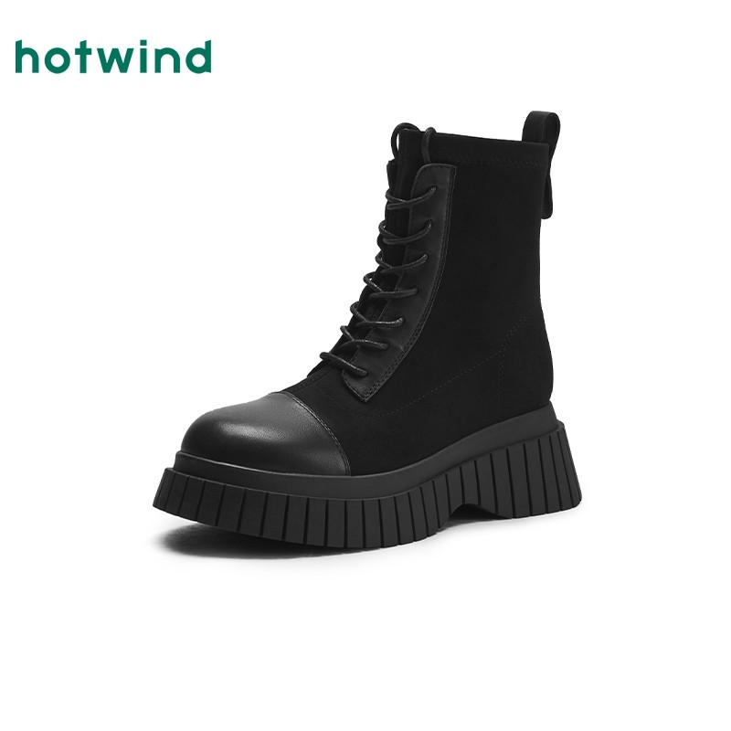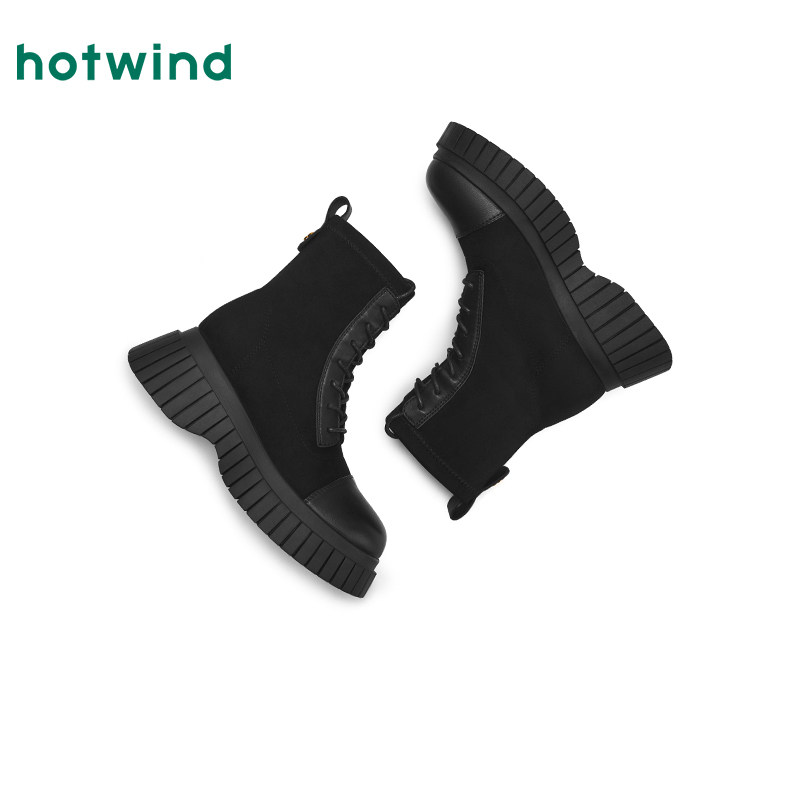 热风秋季新款女士复古短筒厚底时装靴质感拼接休闲马丁靴女
