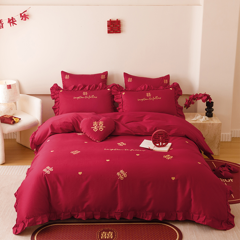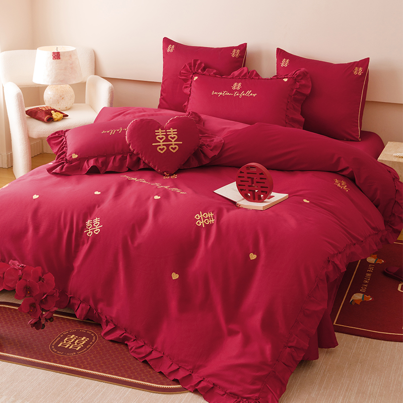 金喜鸟家纺简约中式婚庆爱心双喜刺绣长绒棉结婚四件套大红色纯棉