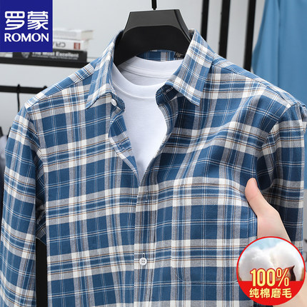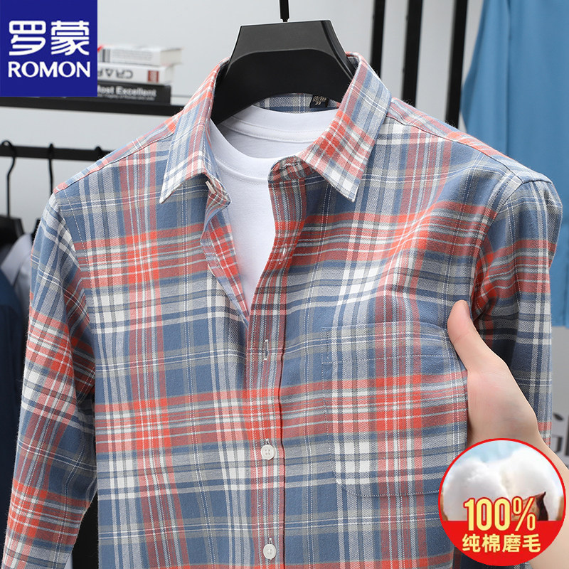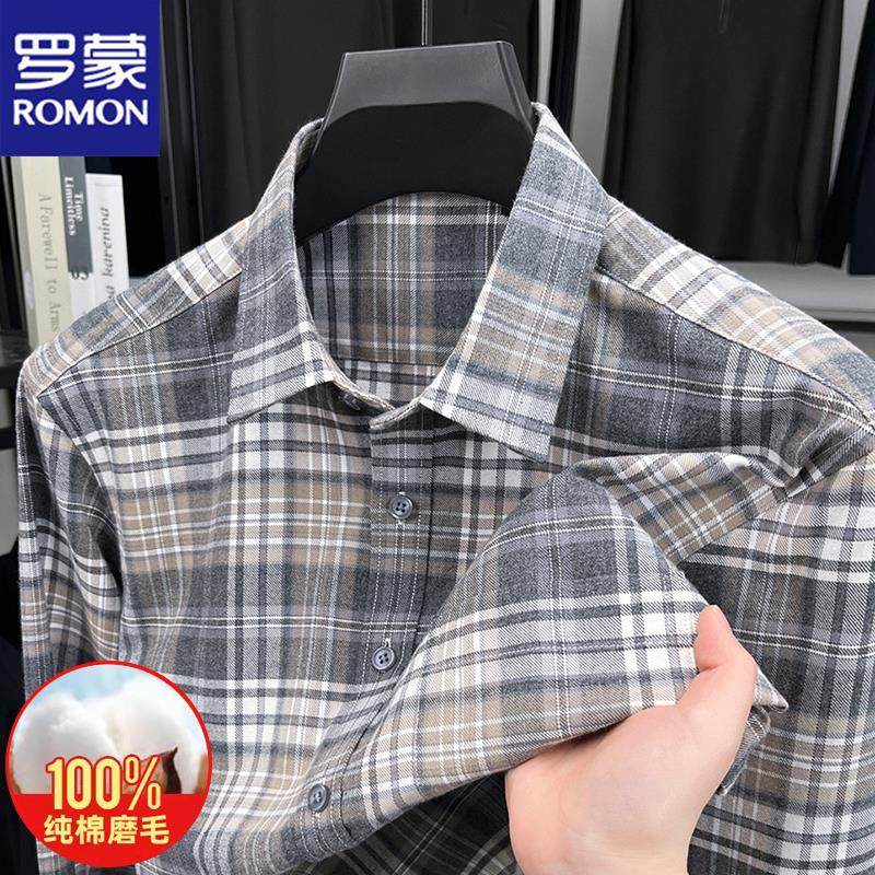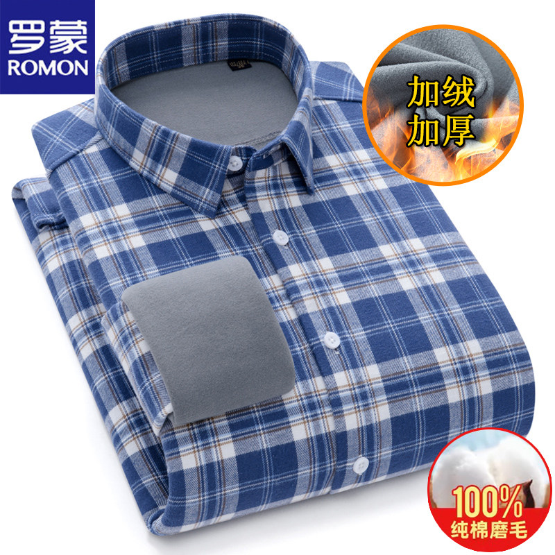 100%纯棉罗蒙长袖衬衫男士格子秋冬季全棉磨毛加绒保暖衬衣真口袋