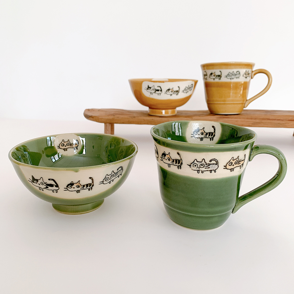 日本进口濑户烧散步猫咪织部黄糖色釉陶瓷马克杯可爱猫咪水杯饭碗