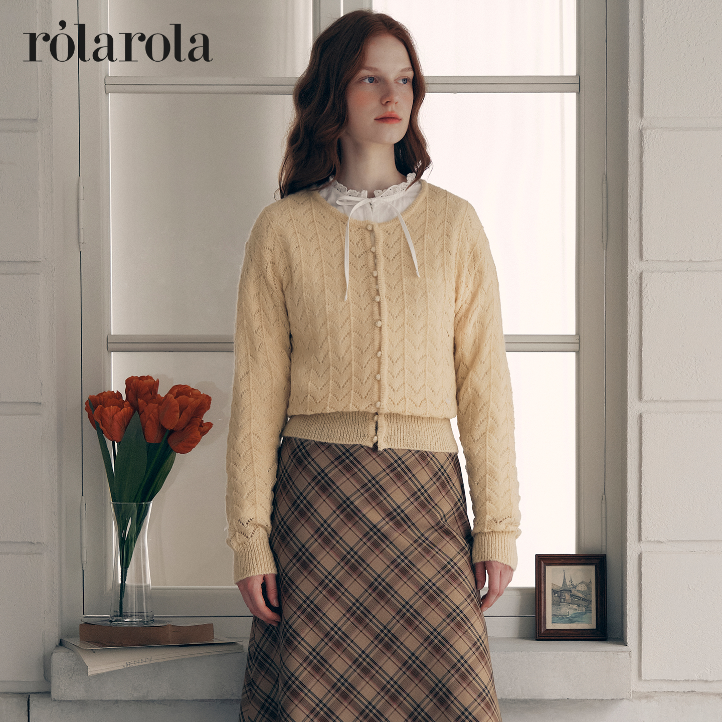ROLAROLA25年秋季新款镂空针织开衫甜美少女短款羊毛混纺毛衣外套