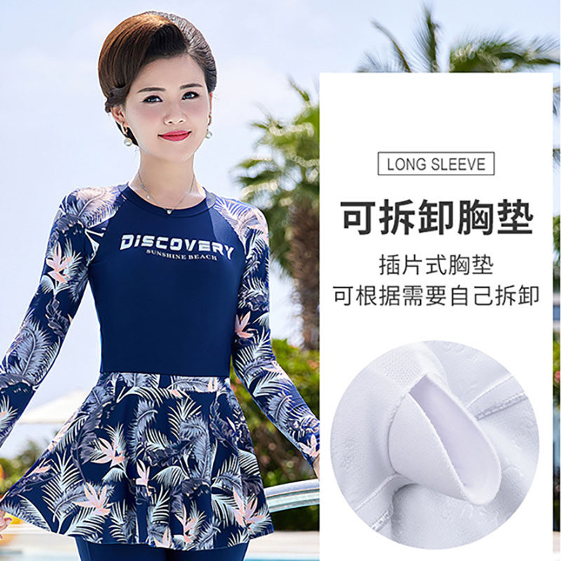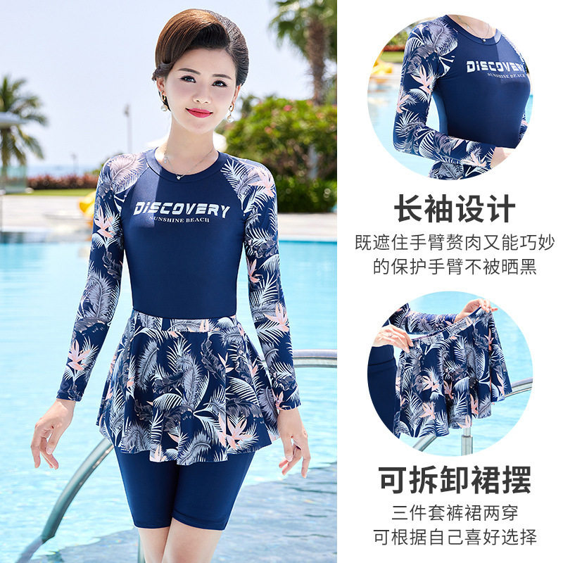 妈妈泳衣女2025新款长袖保守遮肚显瘦分体式中老年泡温泉三件套装
