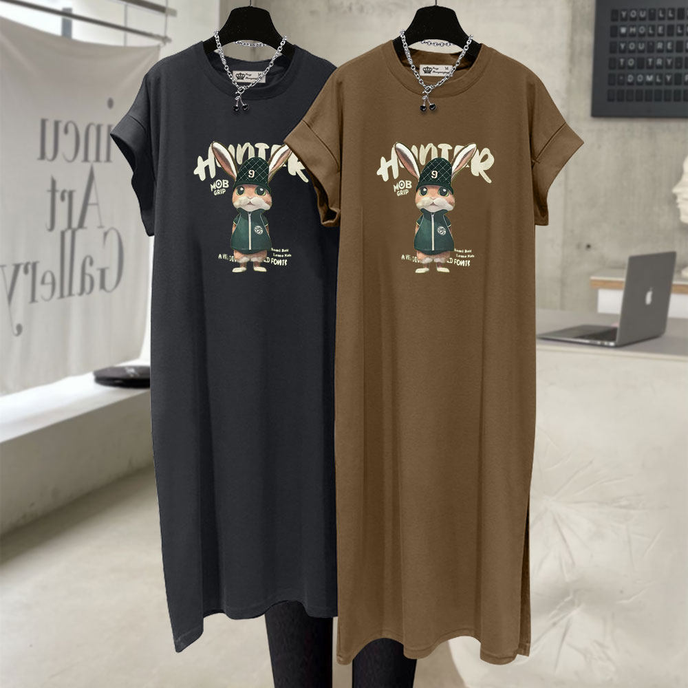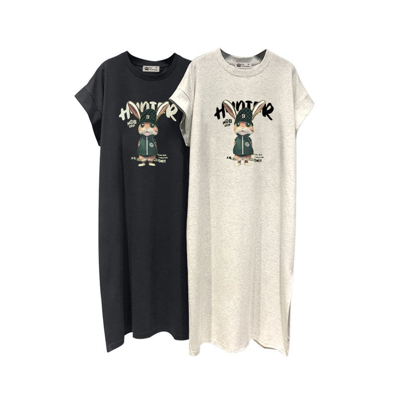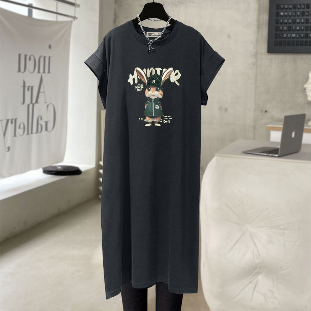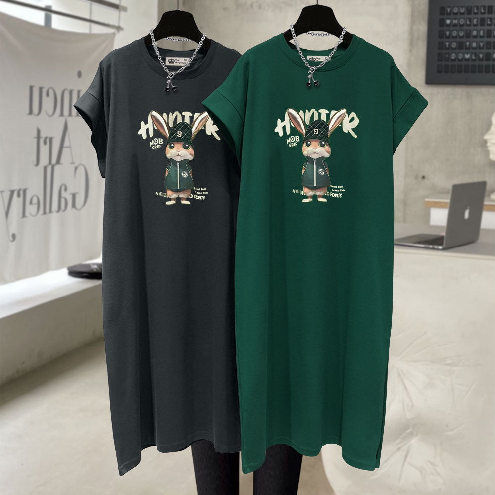 小个子连衣裙女2025夏收腰中长款过膝开叉字母洋气兔子短袖T恤裙