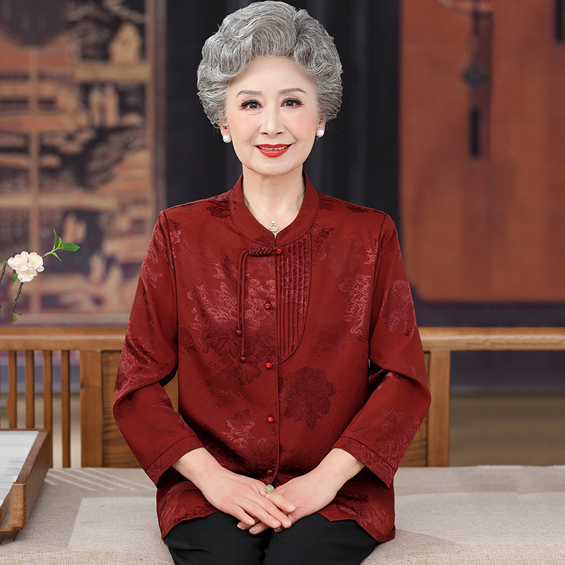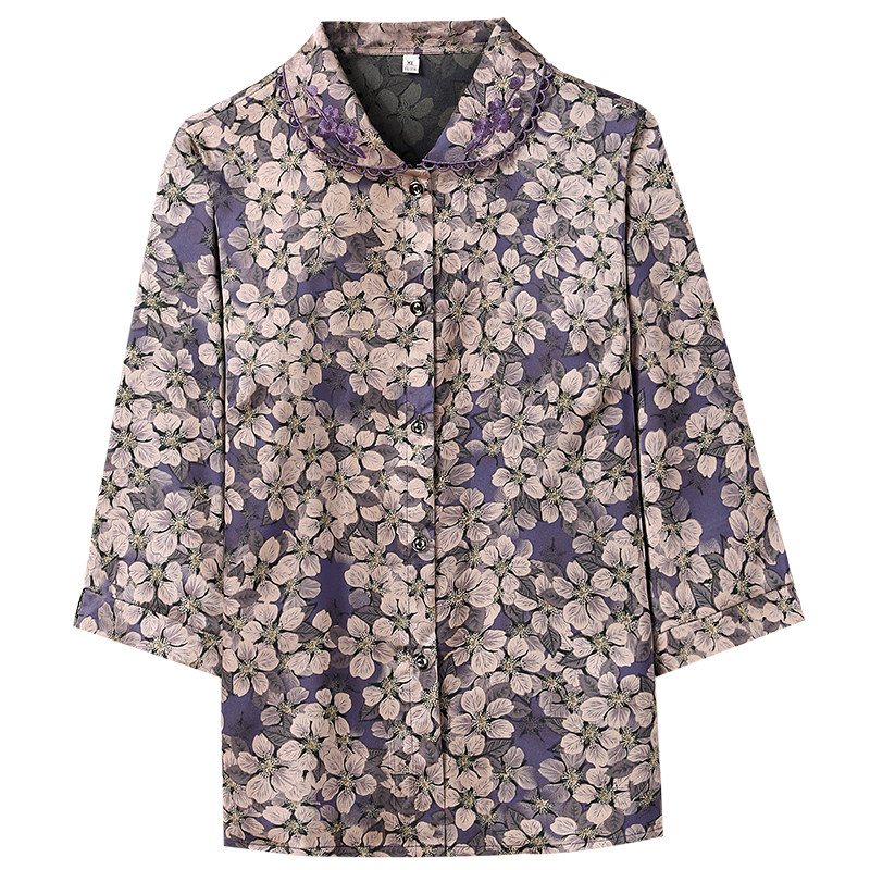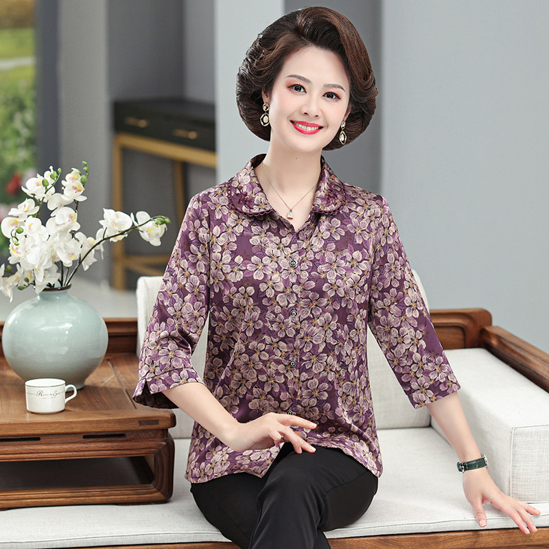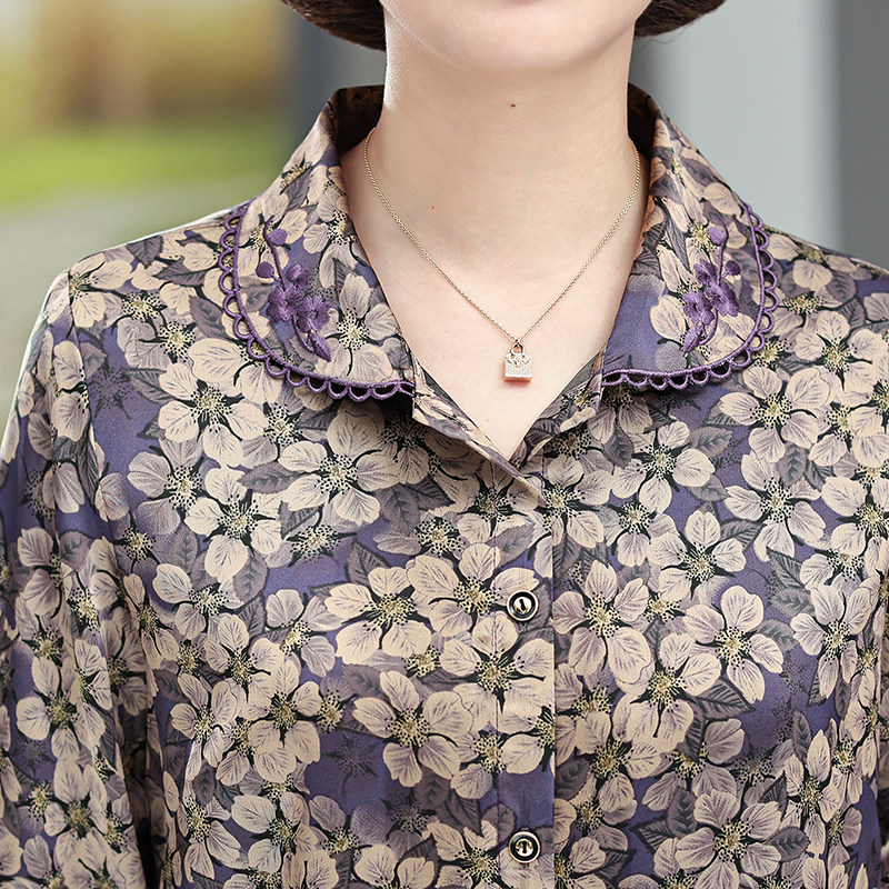 高档中老年妈妈碎花真丝衬衫大码春夏季香云纱上衣气质套装衬衣女