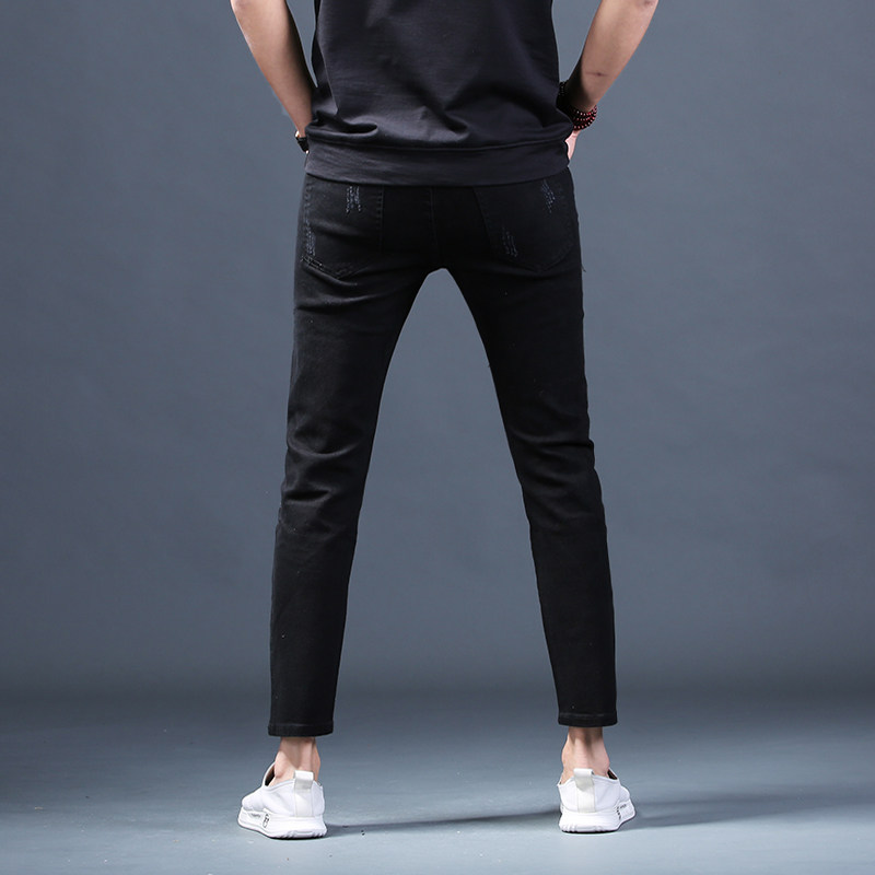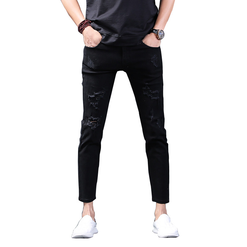破洞牛仔裤男士九分裤刮烂磨破夏季修身潮流9分小脚乞丐黑色男裤