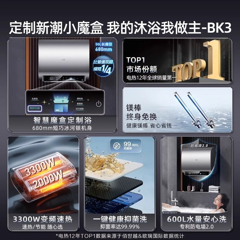 海尔双胆电热水器双胆家用卫生间洗澡一级能效60升BK3