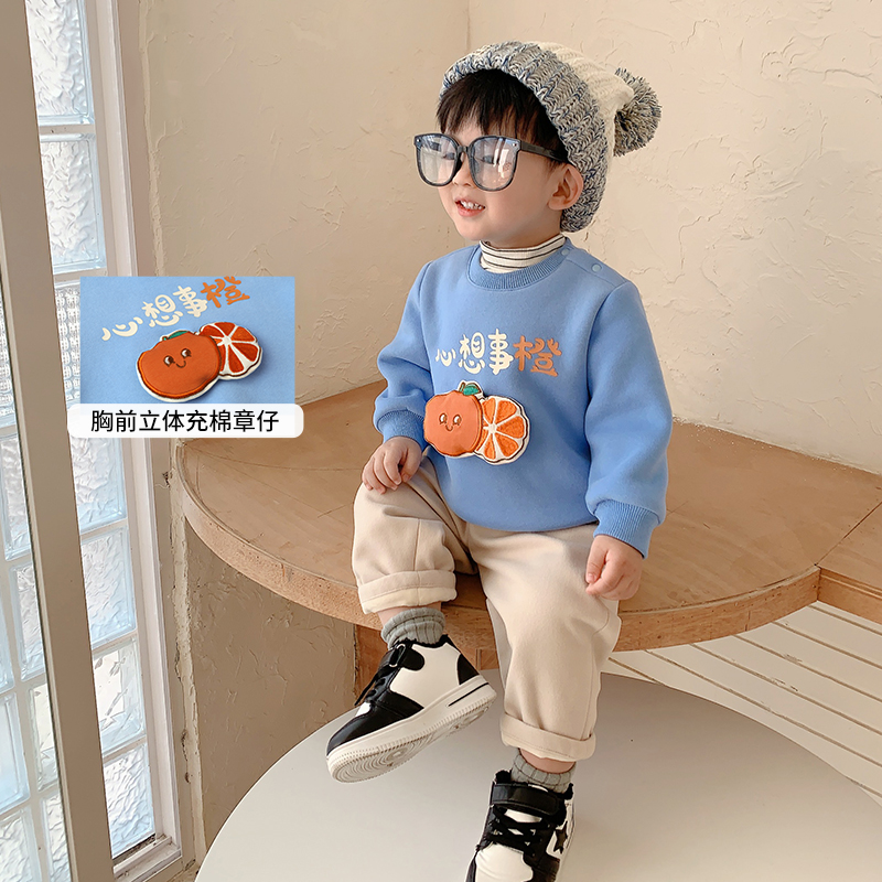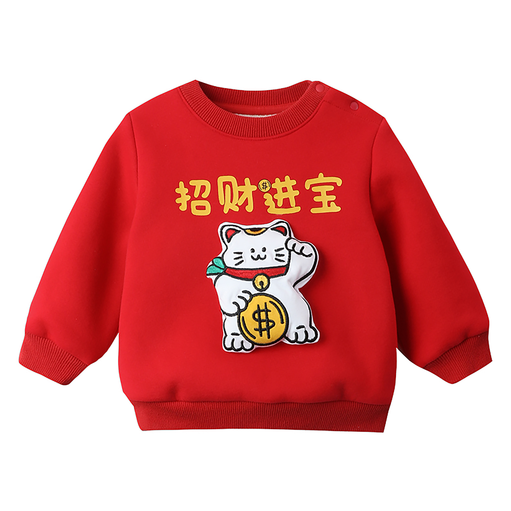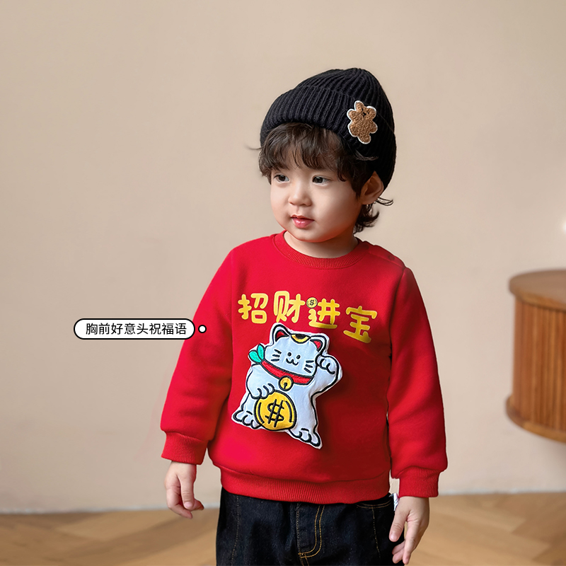 小O爸男婴童 宝宝卫衣加绒红色过年保暖冬季可爱圆领婴儿衣服