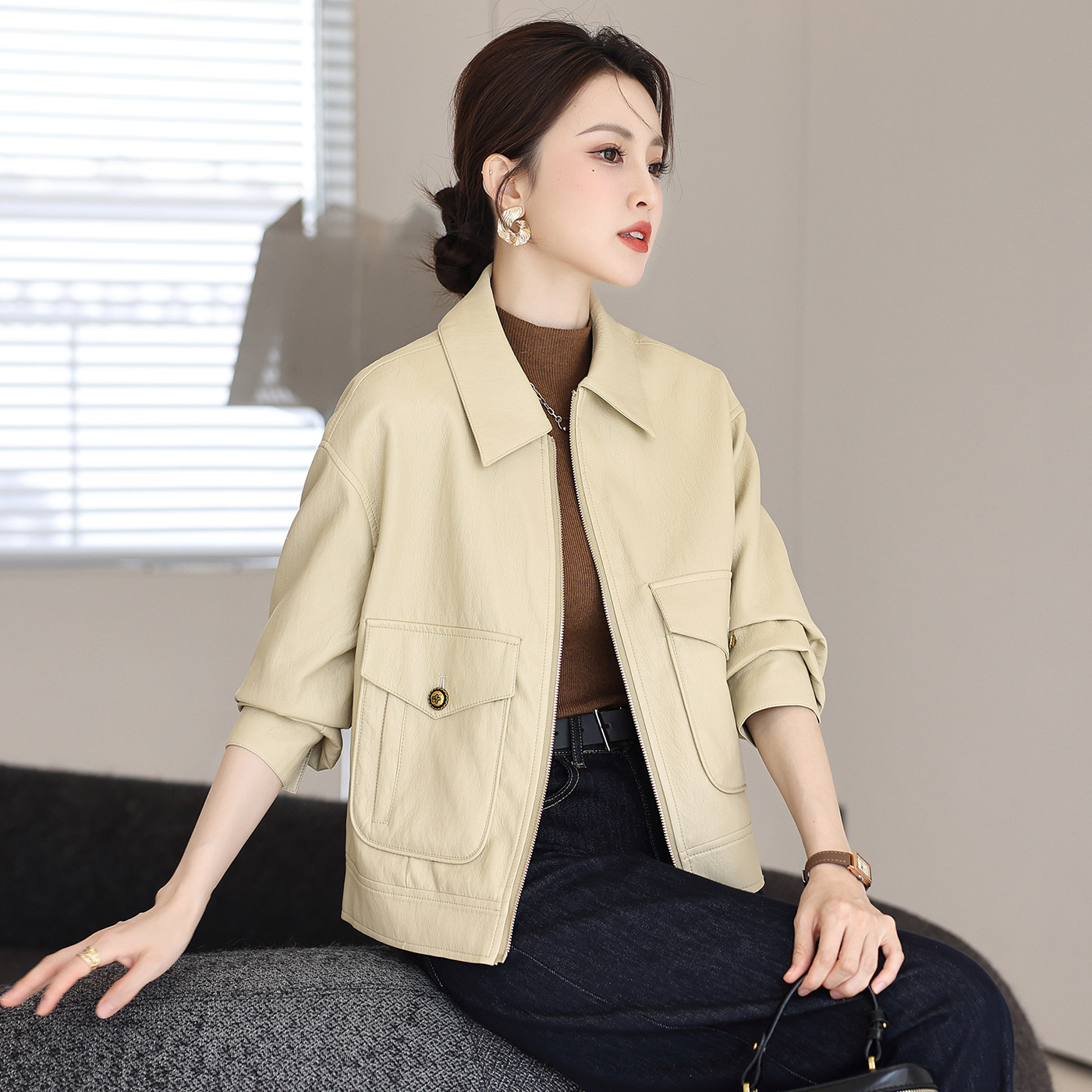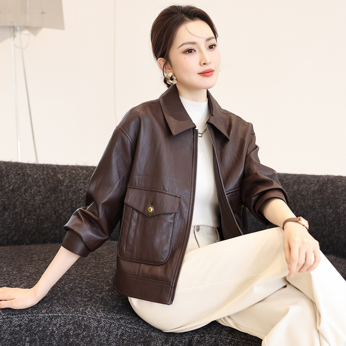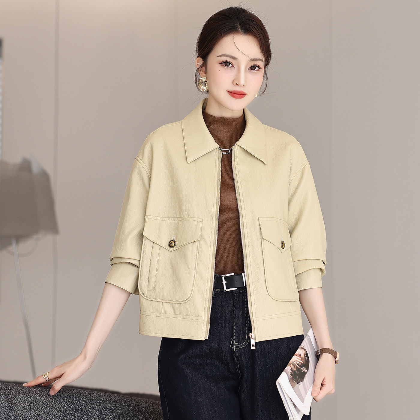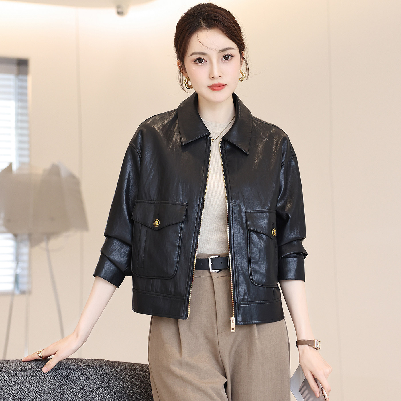海宁皮衣女短款宽松休闲显瘦夹克