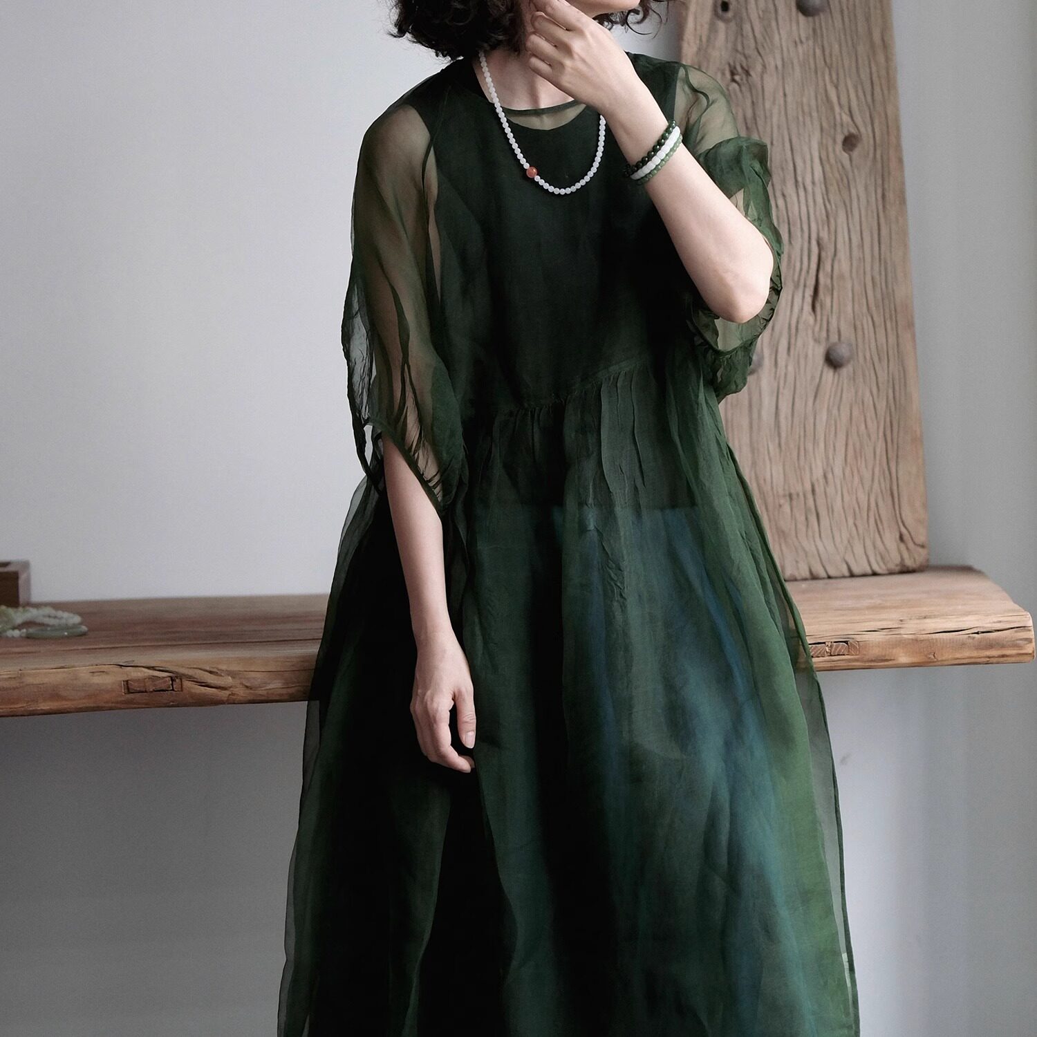 远家植物染真丝欧根纱罩裙柿子染蓝染套染连衣裙不含内搭LF3986限