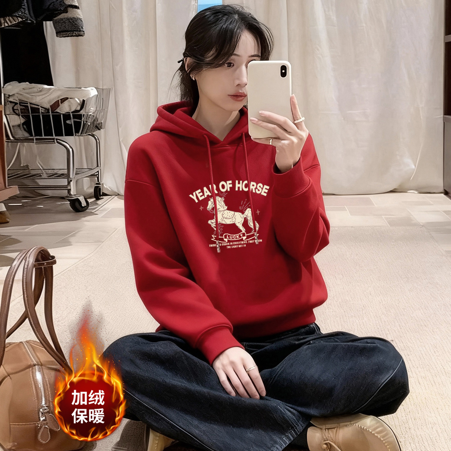 新年红色连帽卫衣女2026马年本命年秋冬外套加绒加厚保暖上衣宽松