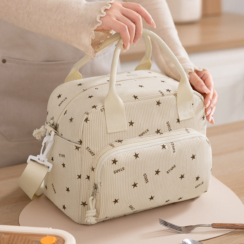 斜挎饭盒袋灯芯绒单肩手提便当包便携式通勤族上班学生出行保温包