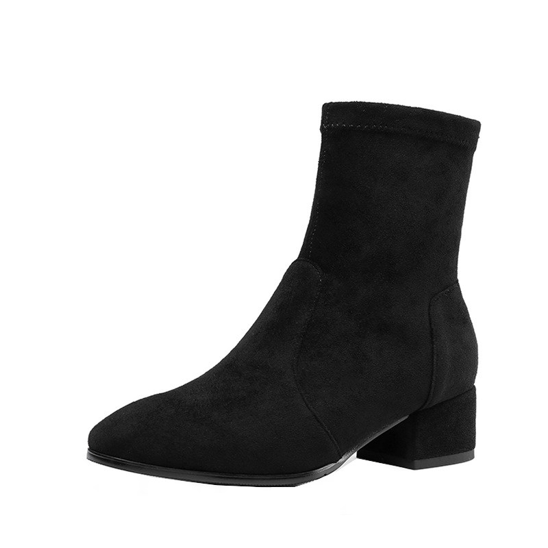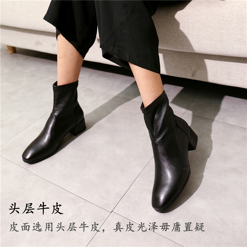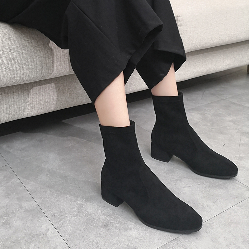 法式短靴女2025秋冬裸靴中跟方头粗跟加绒袜靴网红绒面弹力瘦瘦靴