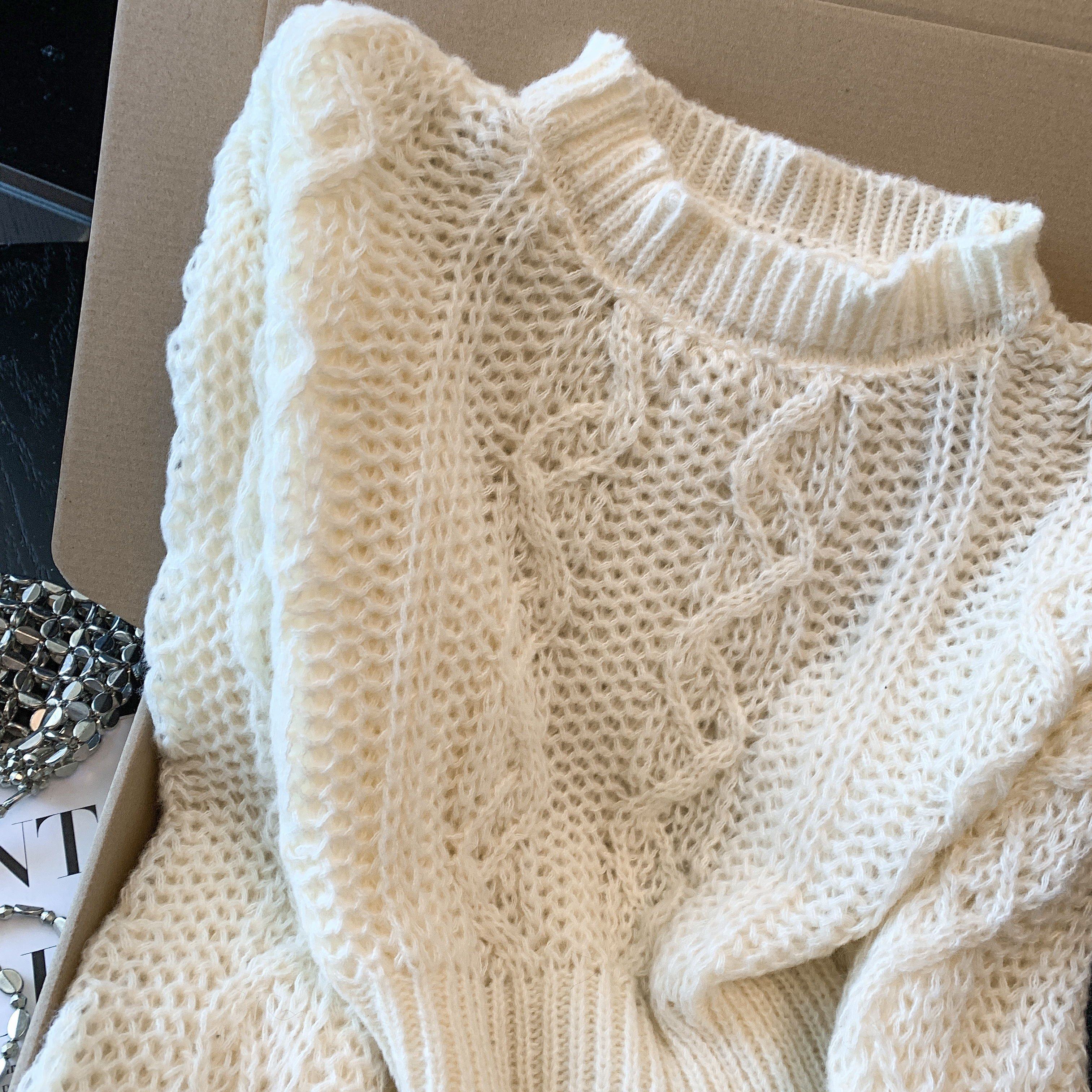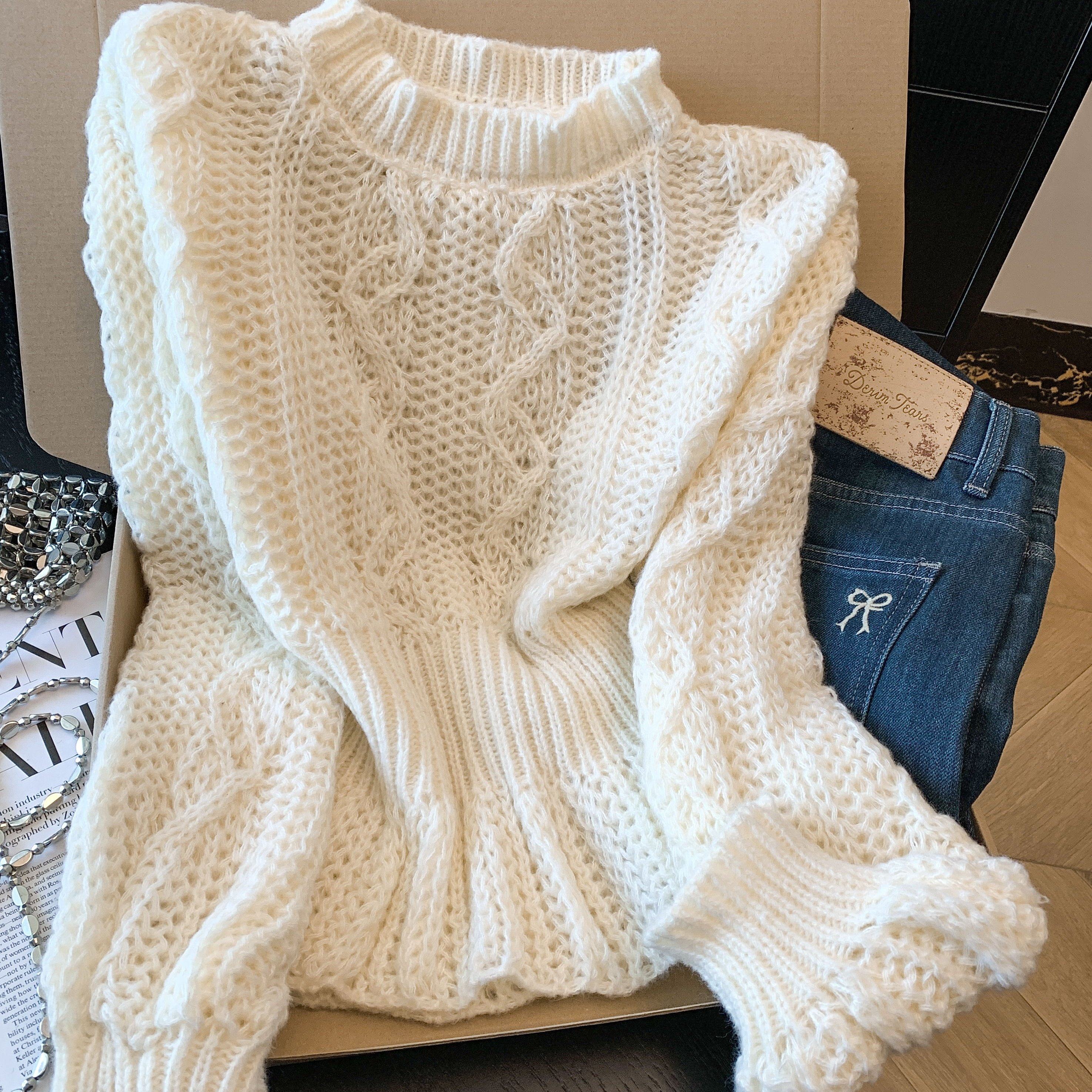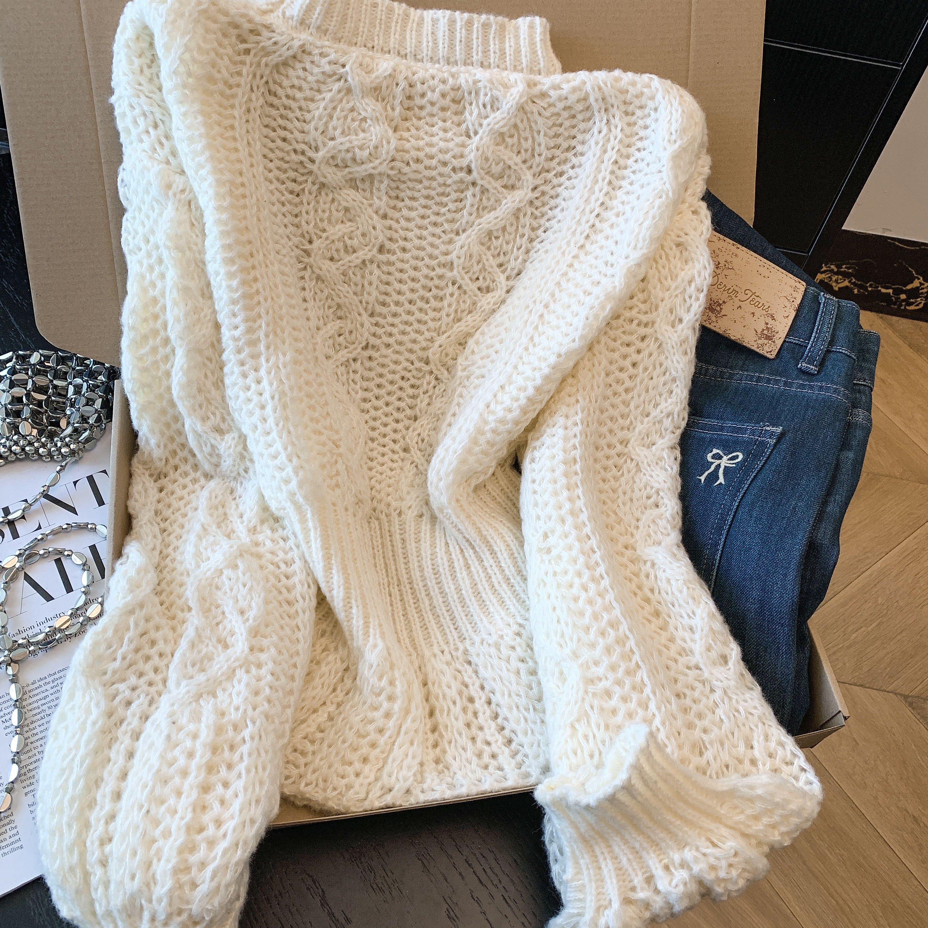 美拉德甜美风软糯套头高领针织毛衣女秋冬白色麻花纹理