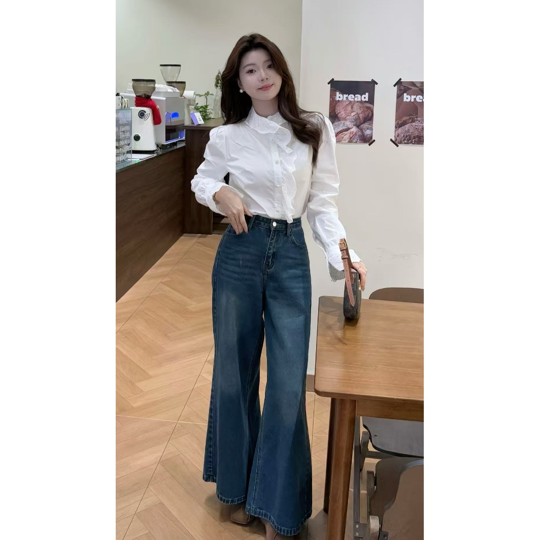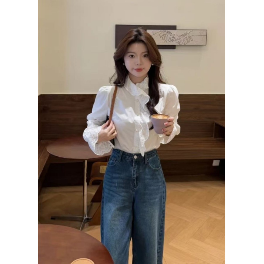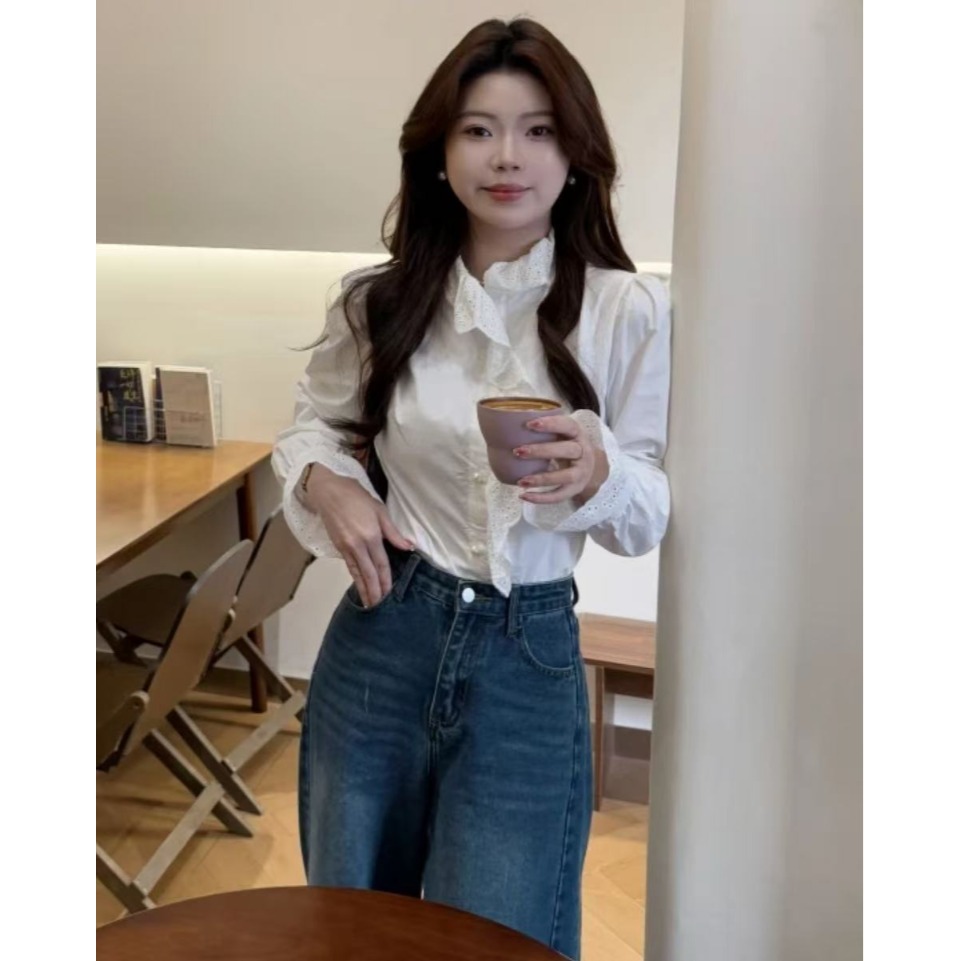 韩系花边飘带白色衬衫女装春季新款木耳边设计感小众宽松长袖上衣