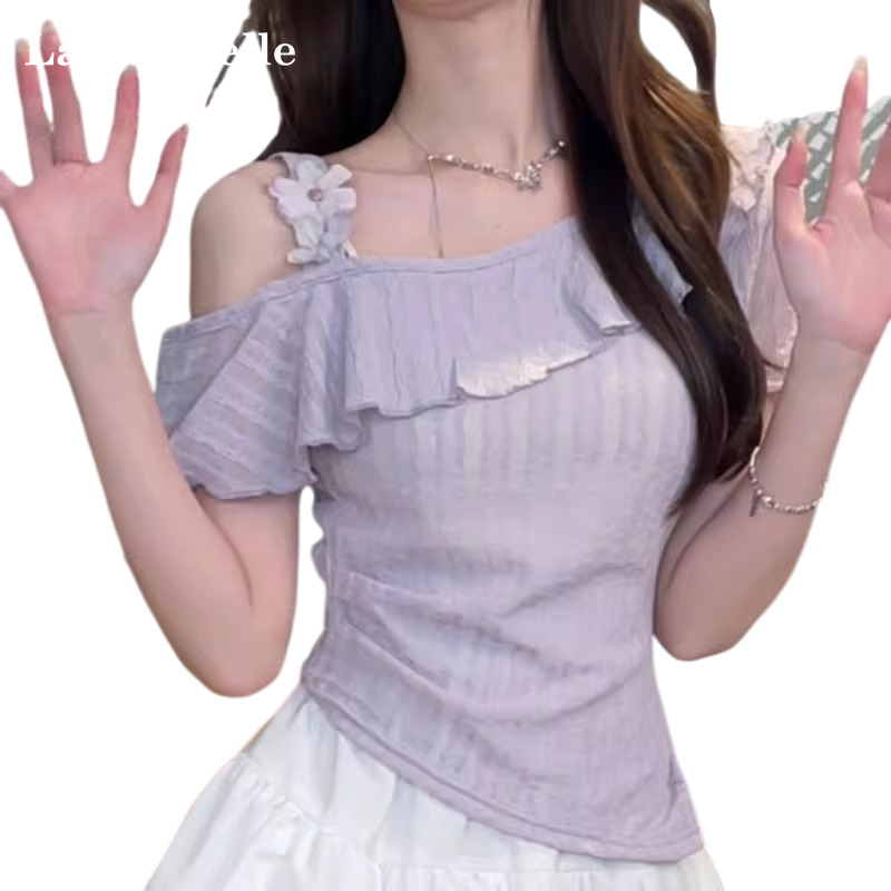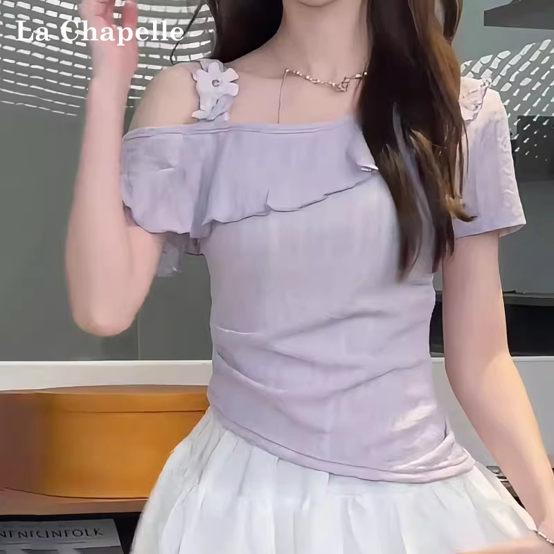 拉夏贝尔欧货紫色斜领露肩短袖T恤女夏季新款时尚收腰减龄上衣