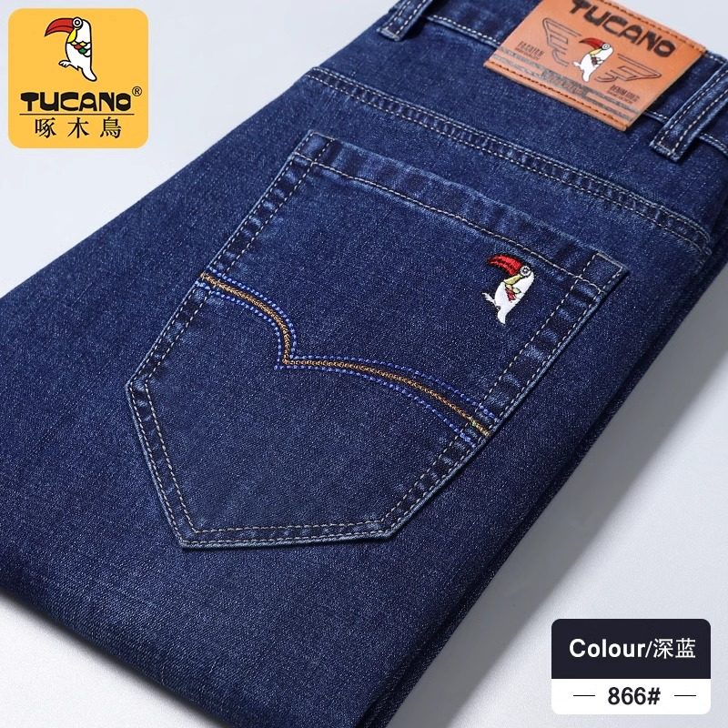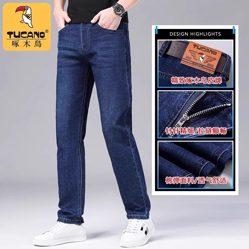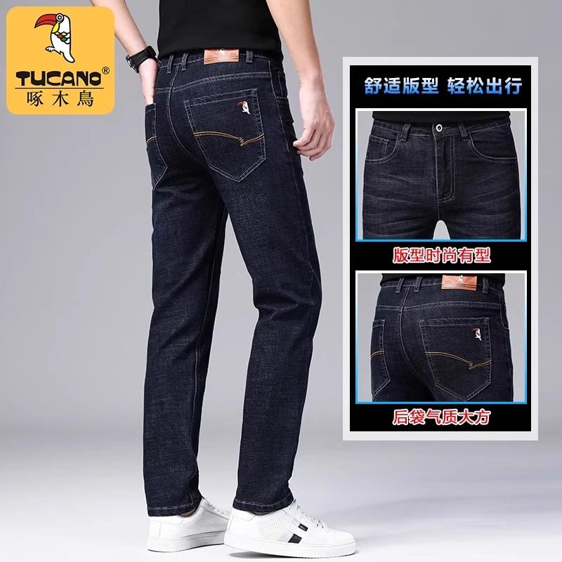 啄木鸟男士加绒牛仔裤直筒宽松弹力大码男裤冬季加厚中年男装长裤