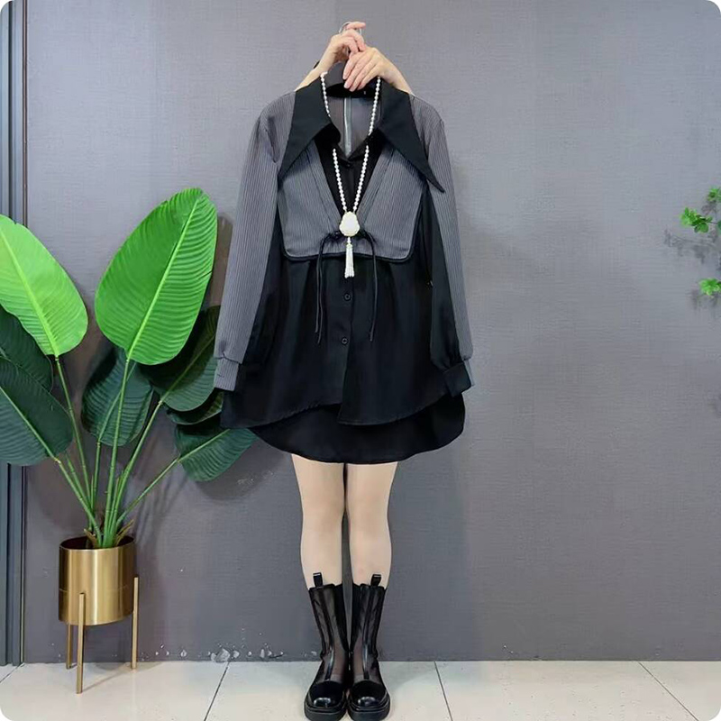 新款韩系设计感假两件中长款衬衫
