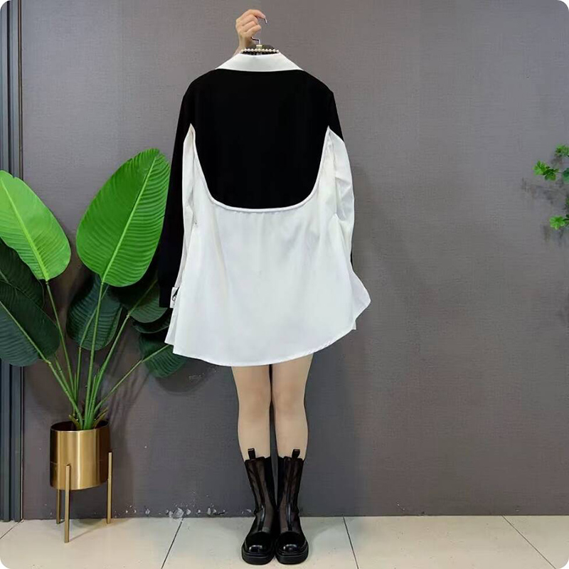 秋季新款韩系设计感假两件中长款衬衫女大码女装胖mm气质宽松上衣