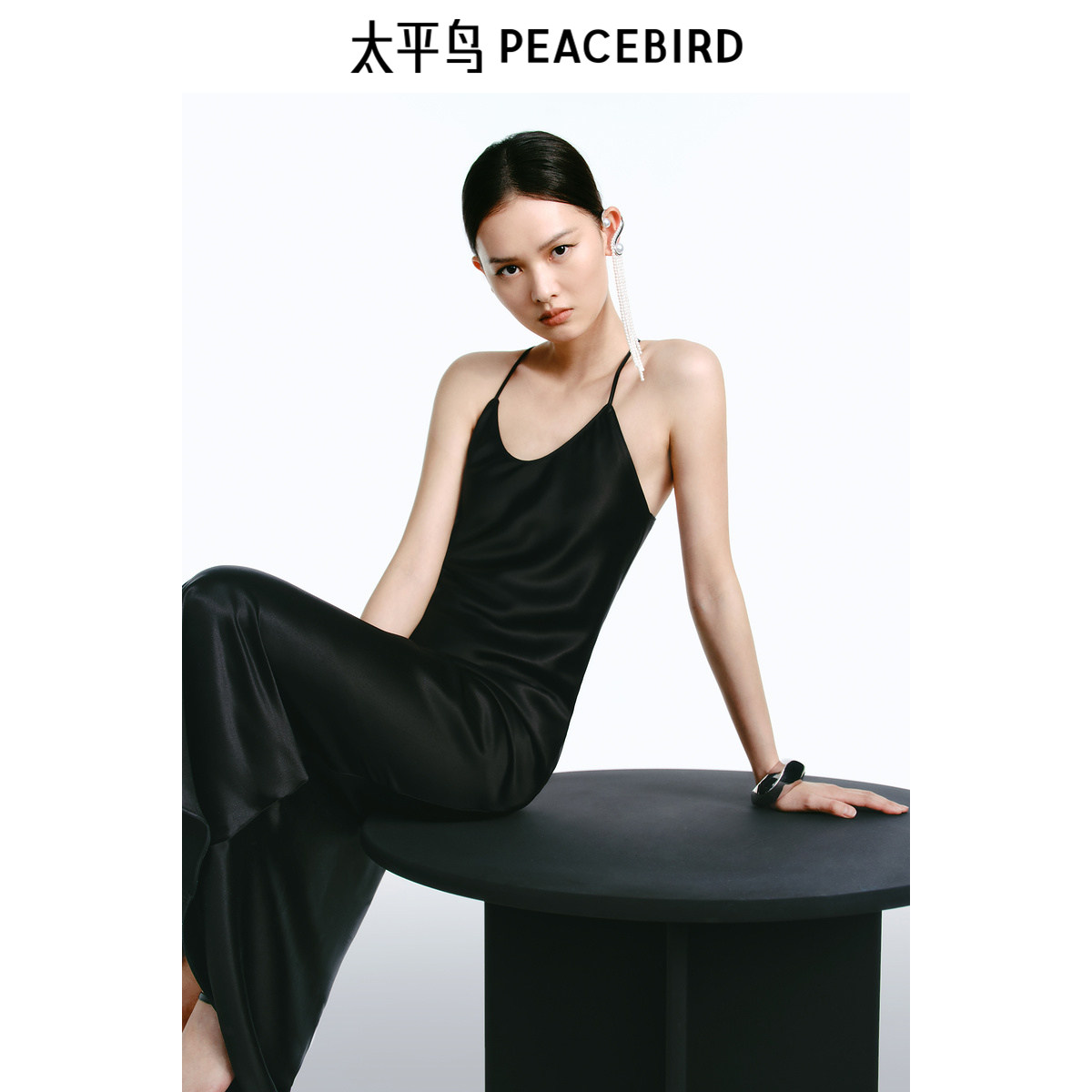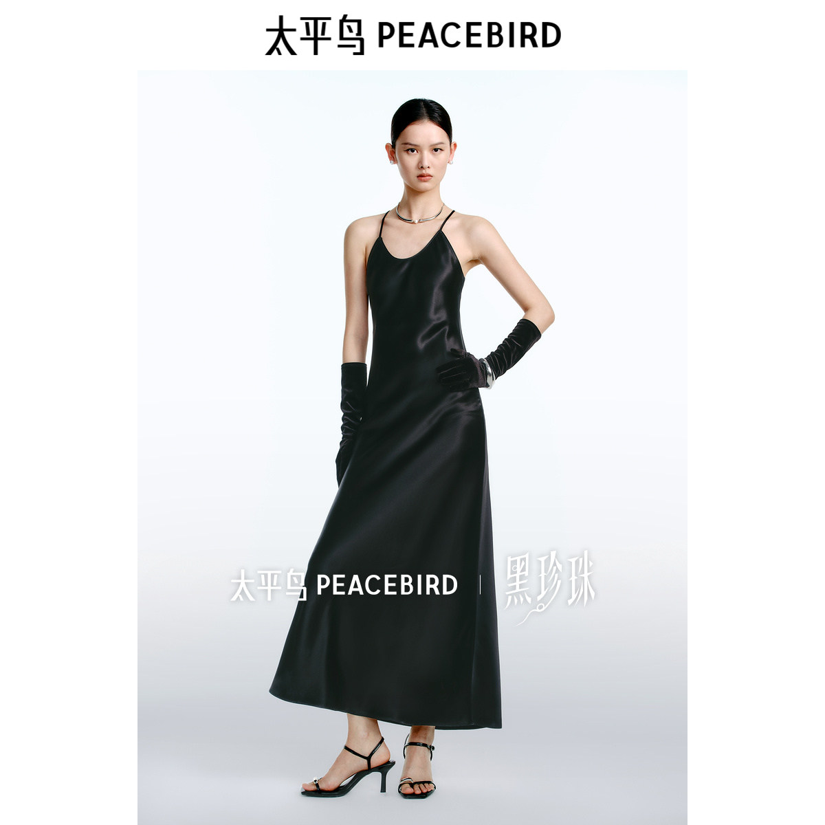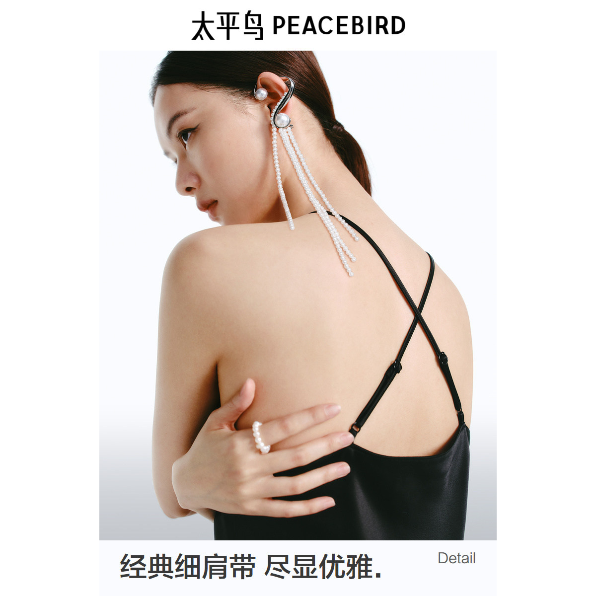 太平鸟小黑裙醋酸吊带连衣裙女2025夏新款细肩带长款修身气质