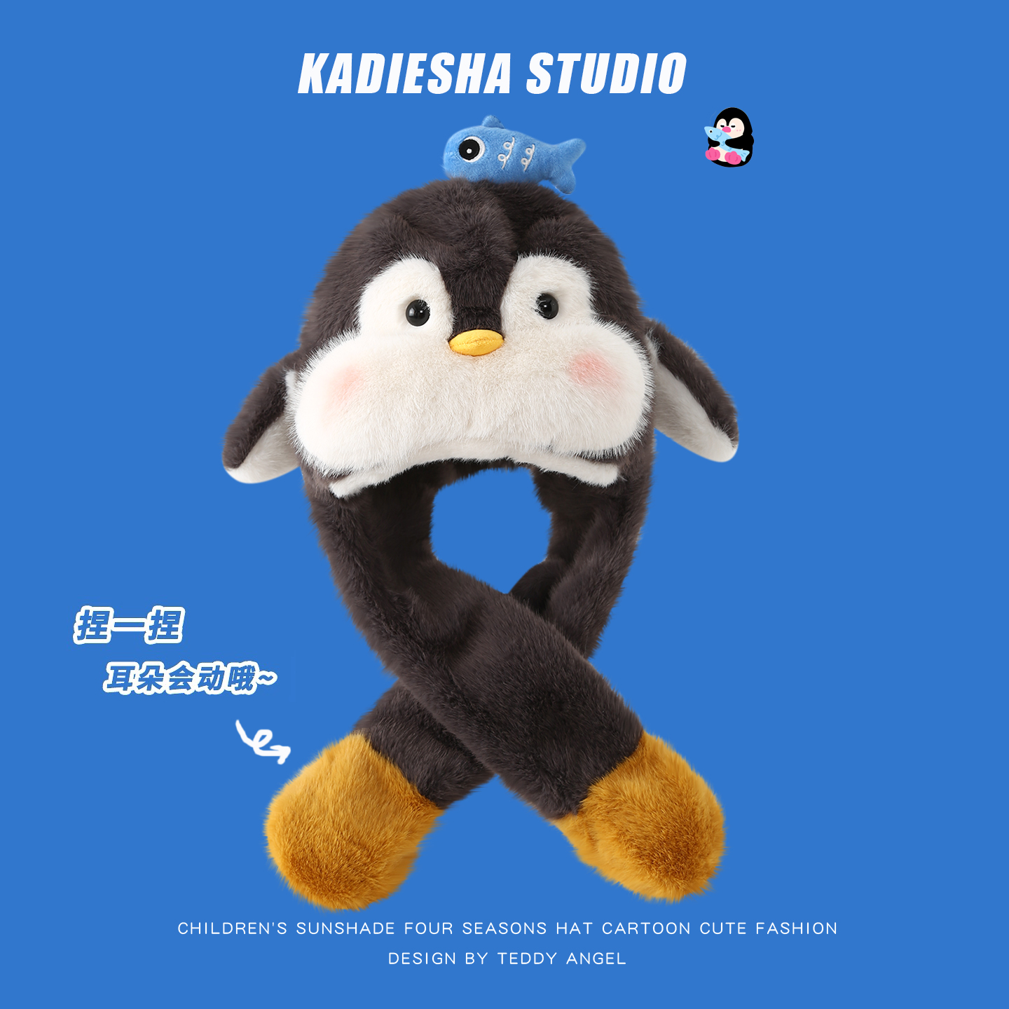 耳朵会动企鹅儿童毛绒帽子围巾一体冬季男女孩宝宝保暖防寒雷锋帽