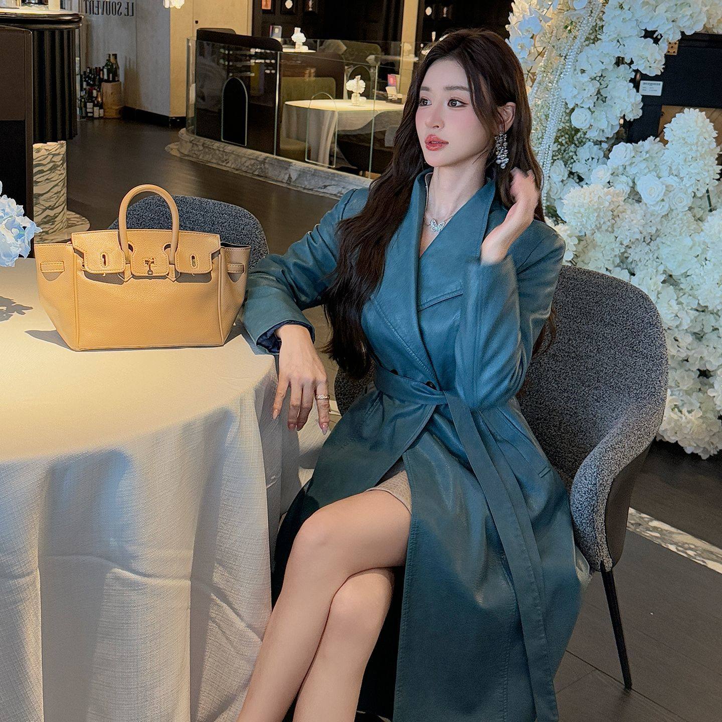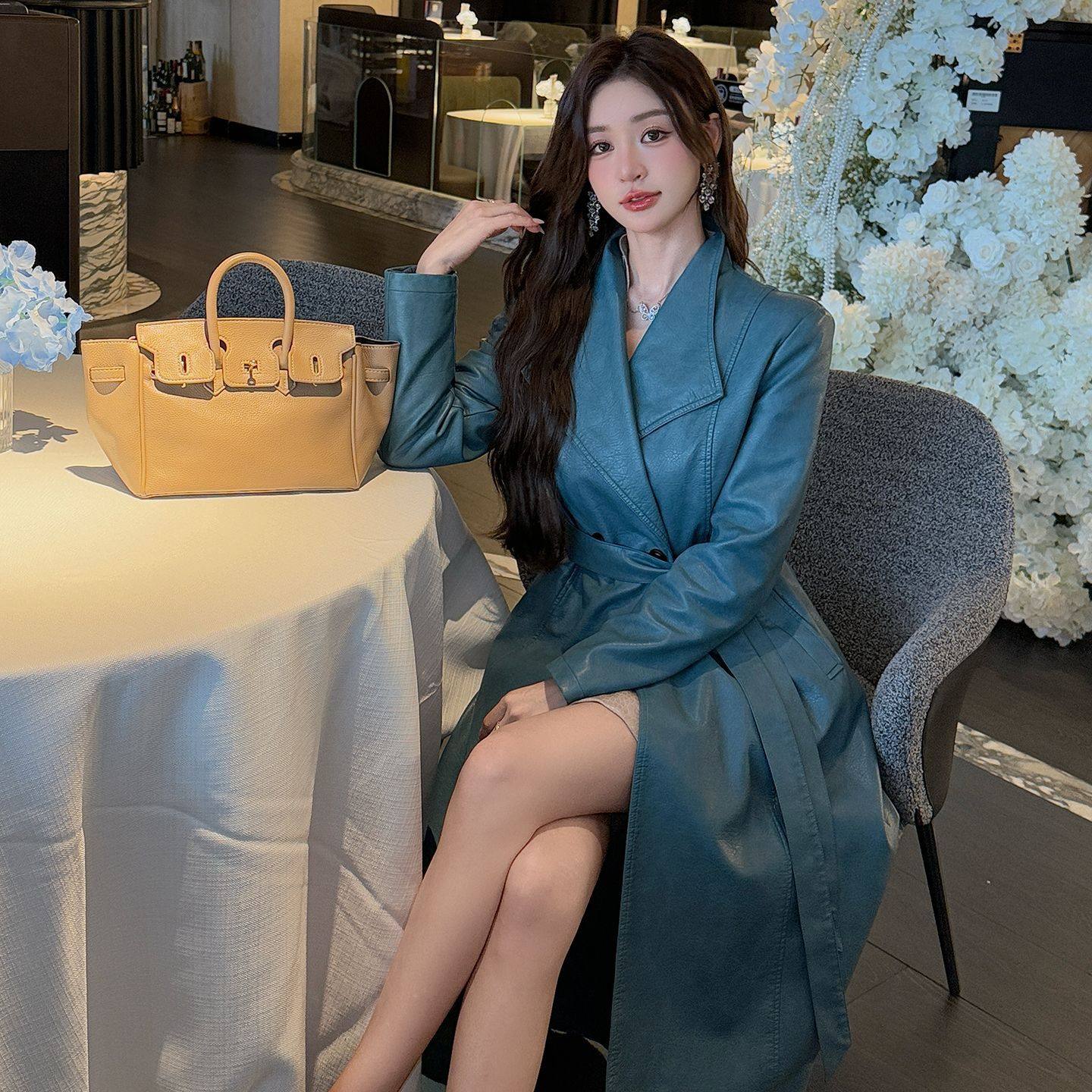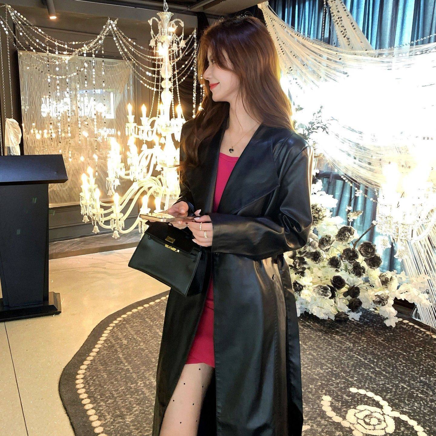 海宁气质大小姐网红皮衣女外套中长新款韩版修身显瘦秋冬款风衣