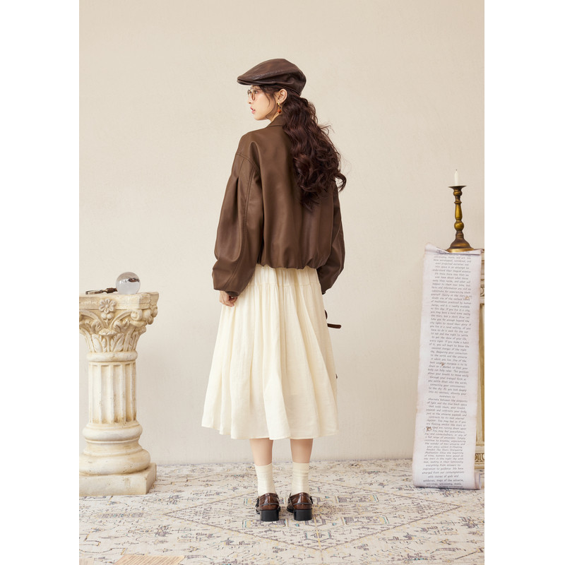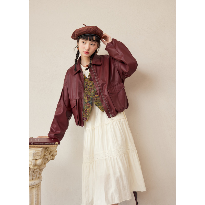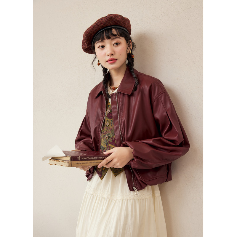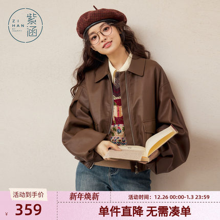 紫涵短款宽松皮衣外套女秋季新款美拉德通勤翻领复古PU皮夹克上衣