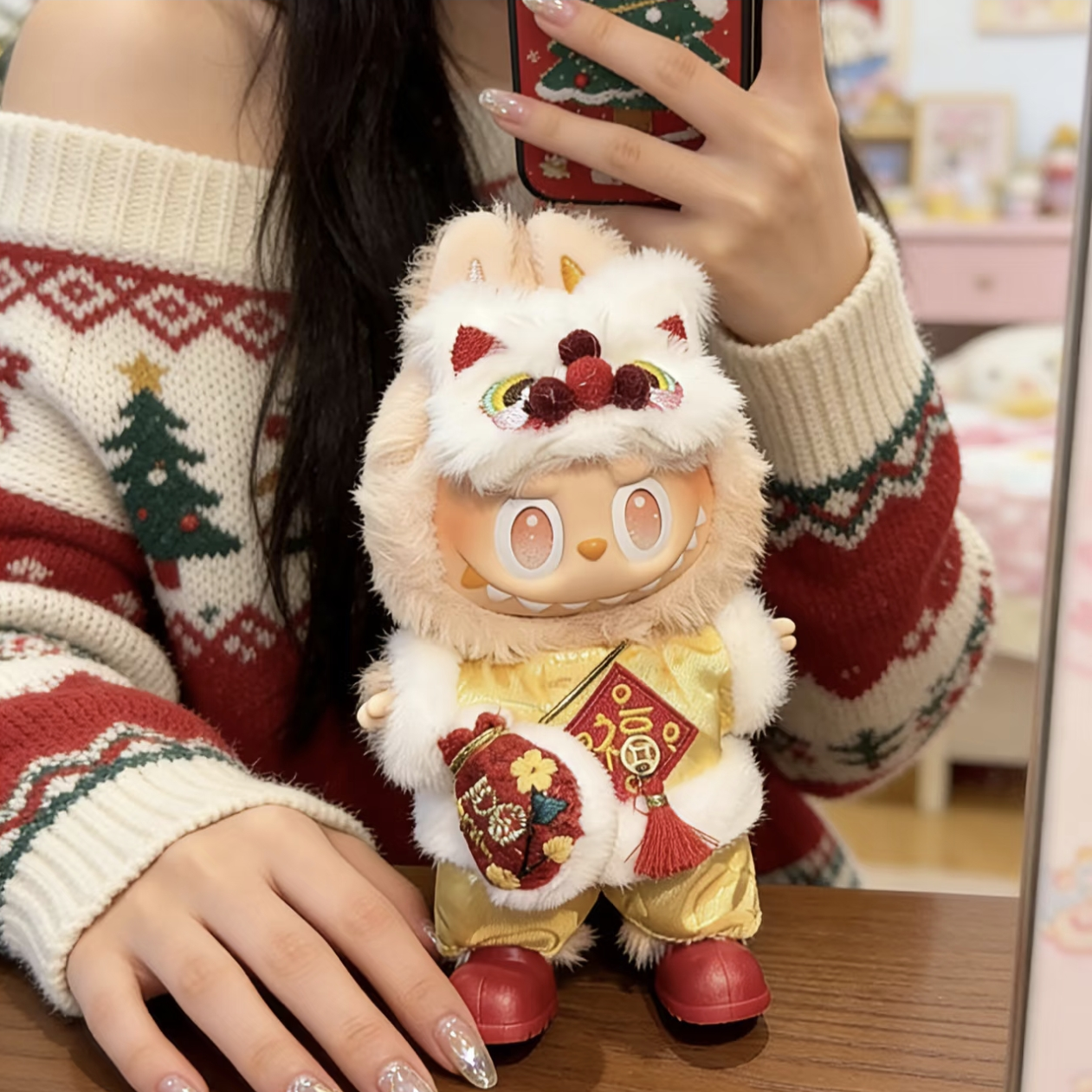 labubu新春喜庆娃衣一二三代醒狮衣服拉布布公仔通用帽子穿戴挂件