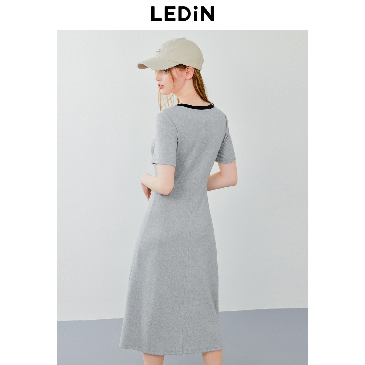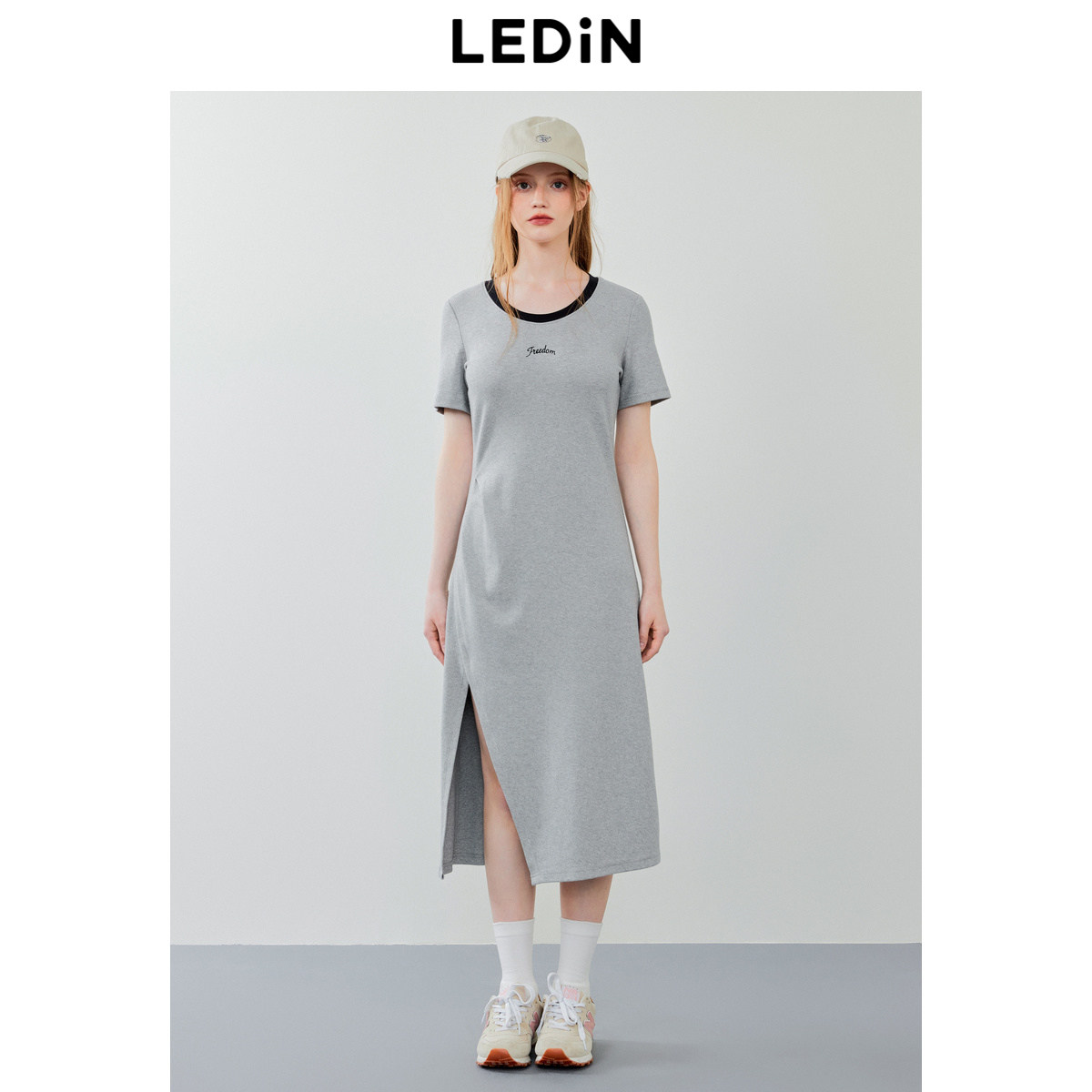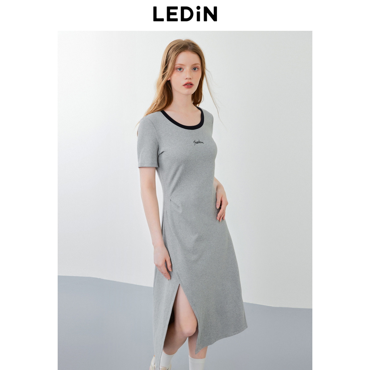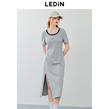 乐町圆领短袖开叉长裙年夏季新款中长款打褶连衣裙宽松T恤裙