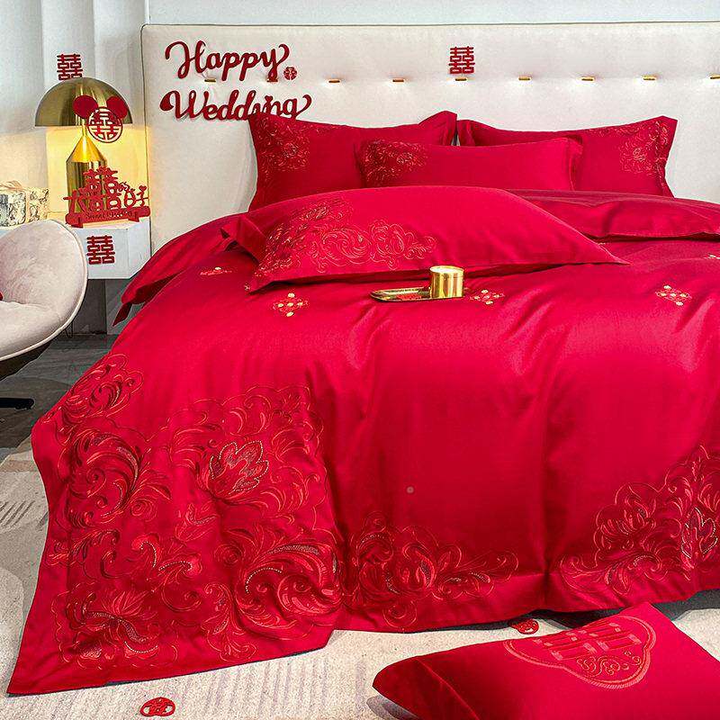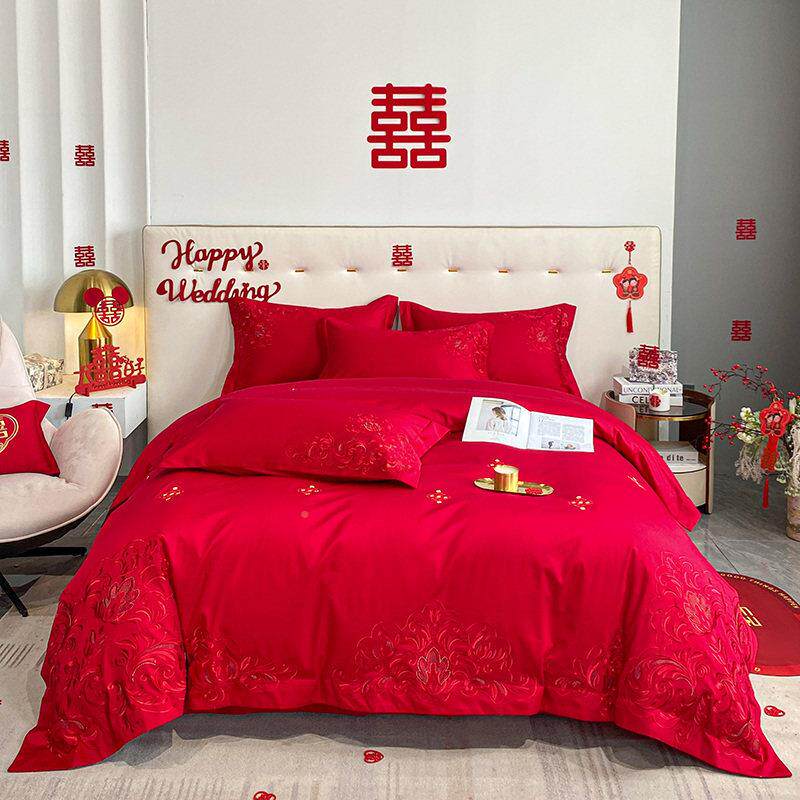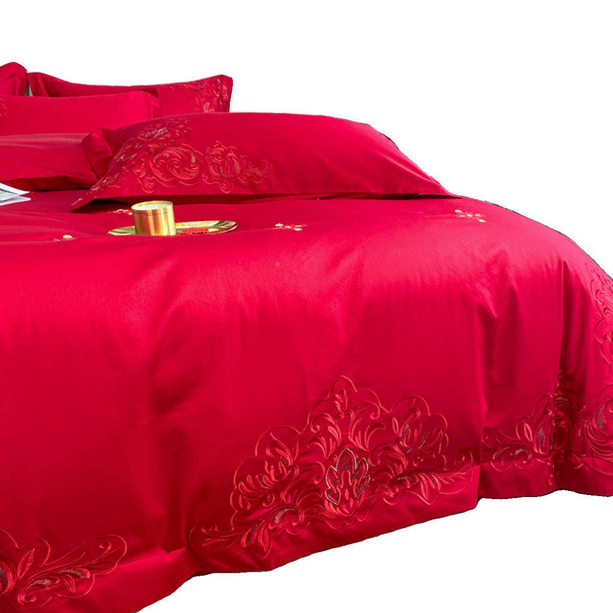 1色0SFS757405婚庆四件套大红棉罩床单欧式陪0嫁被结婚床上用jω