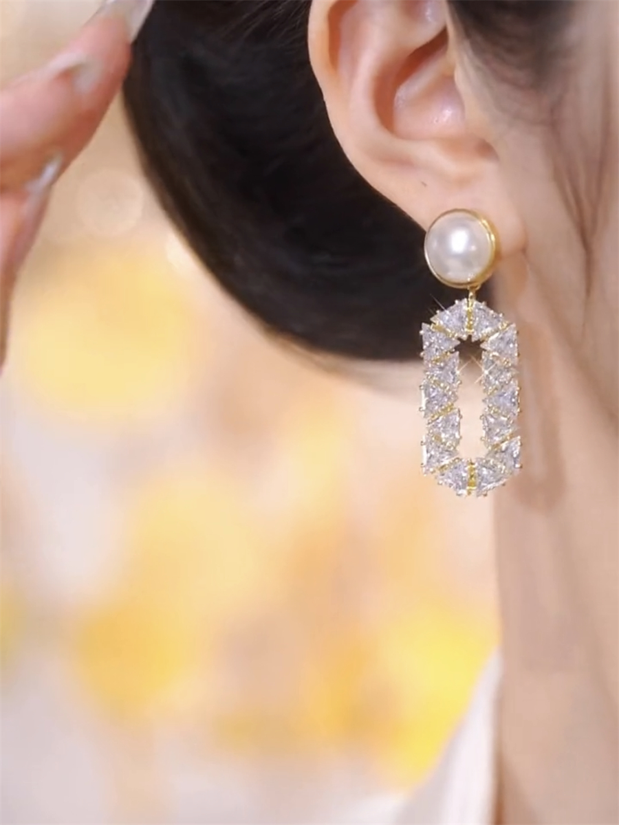 轻奢高级感镂空几何锆石银针珍珠耳环女网红气质显脸瘦耳坠耳饰潮