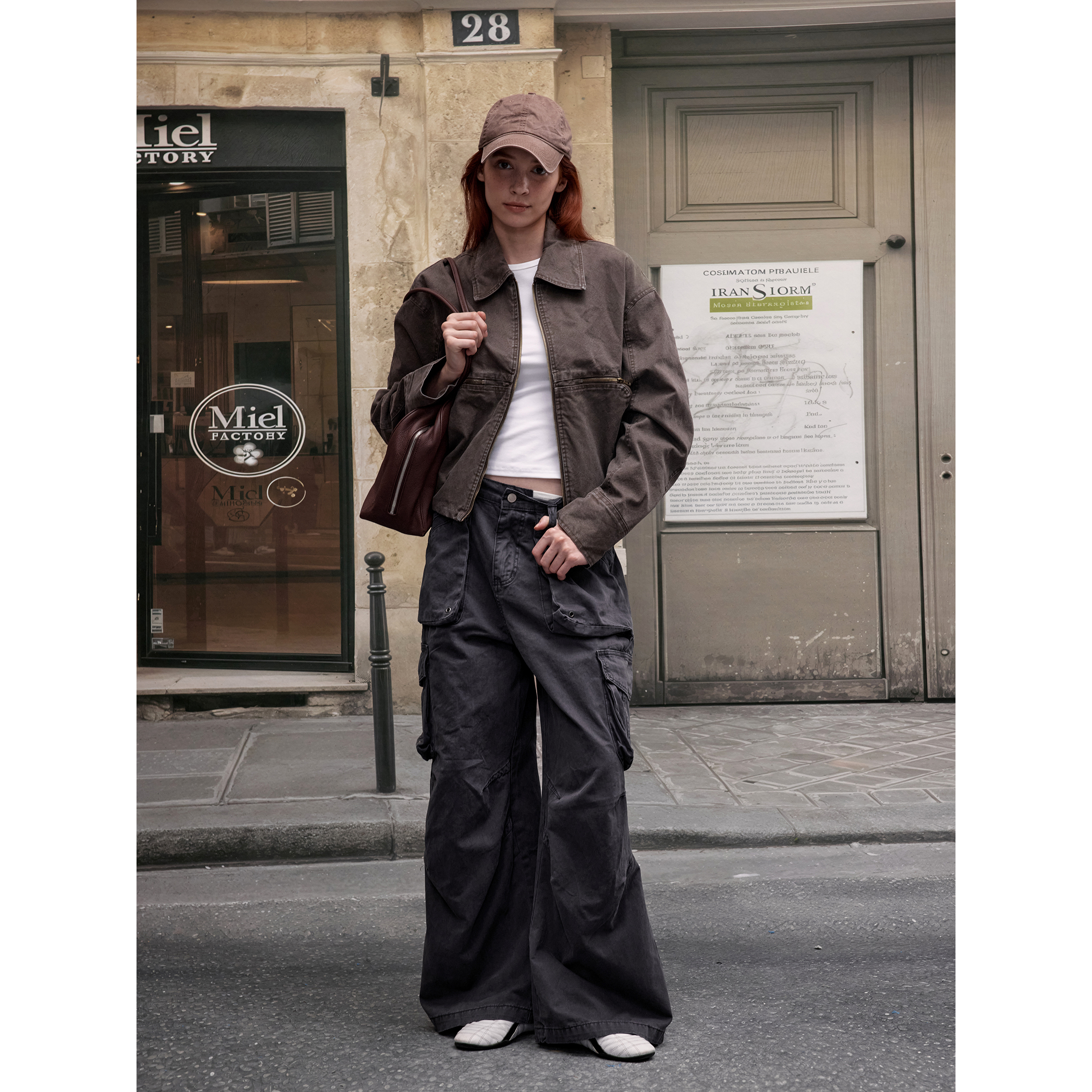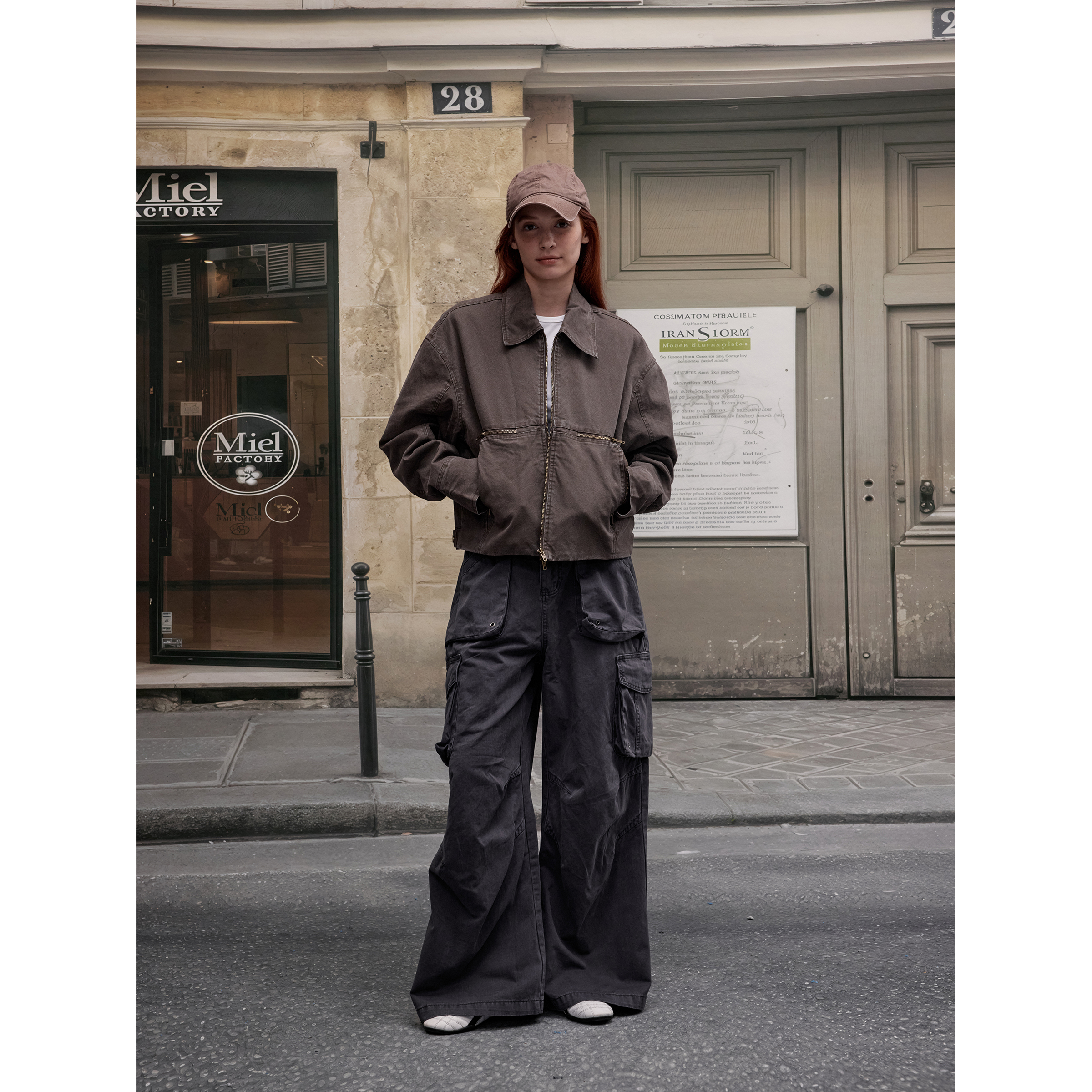 MADWITCH美式复古酵洗翻领工装夹克女修身小板型做旧水洗短款外套