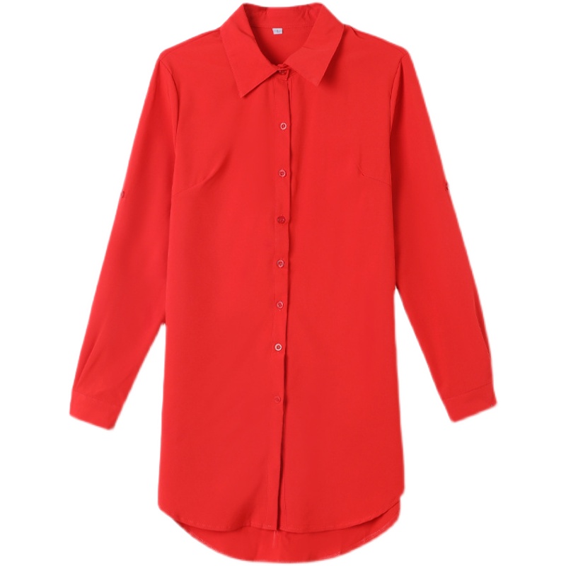 衬衫女士中长款大码女装长袖性感上衣大红色洋气打底衫雪纺衬衣裙