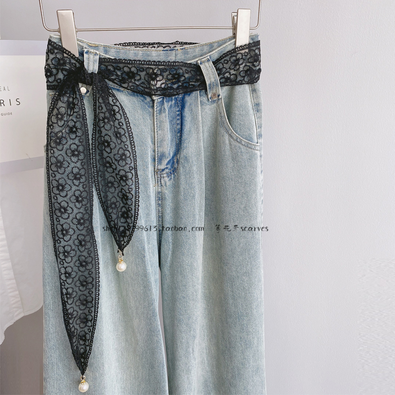 夏季搭配加长款珍珠吊坠裤子裙子装饰蕾丝丝巾腰带腰绳腰饰黑米白