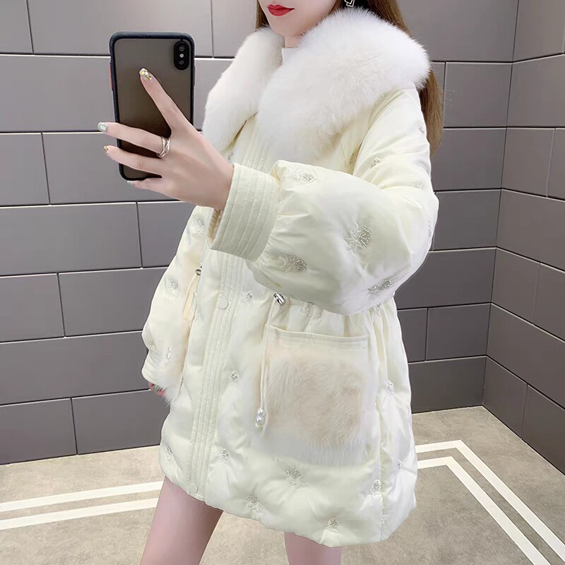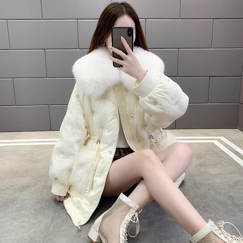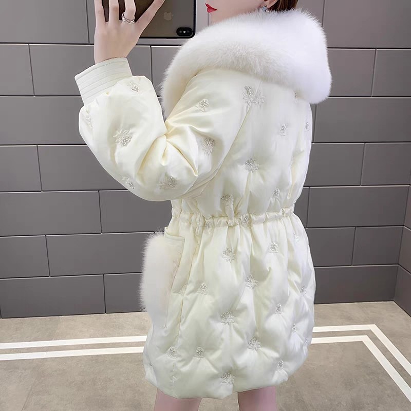 刺绣钉珠羽绒服外套中长款大毛领