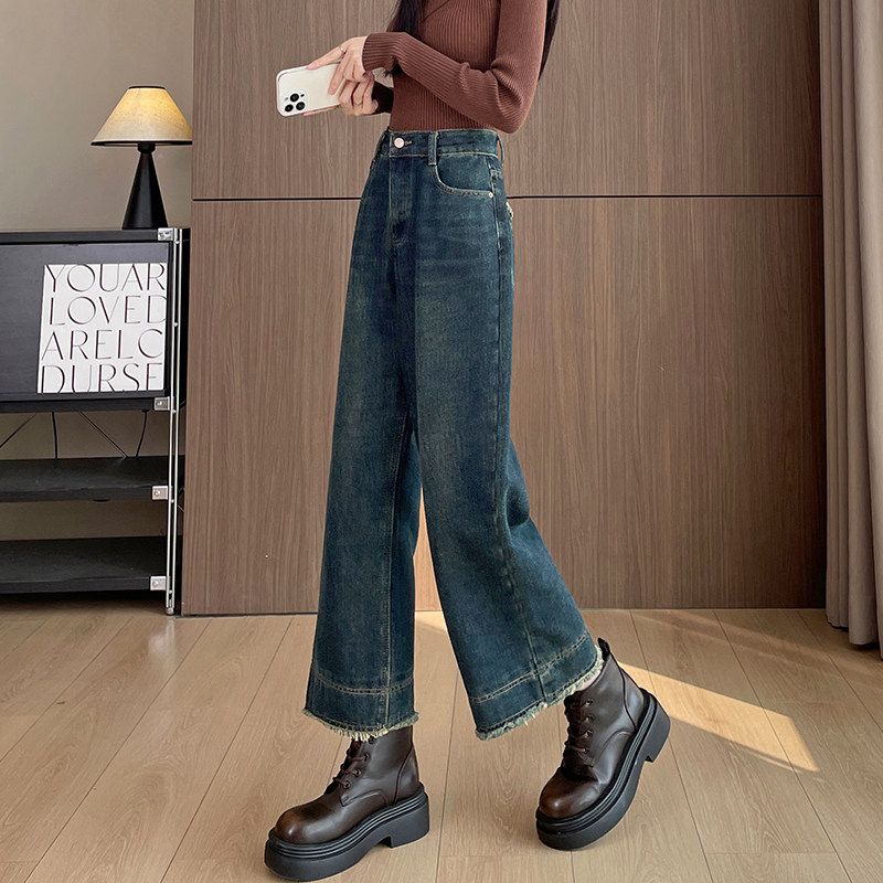 复古阔腿牛仔裤女春秋2025新款高腰宽松显瘦小个子九分毛边直筒裤