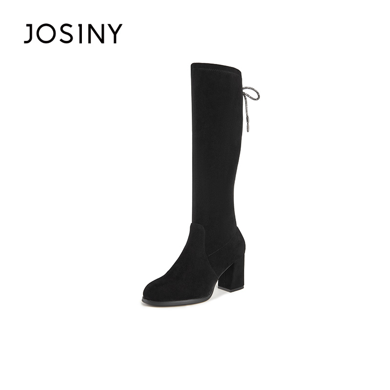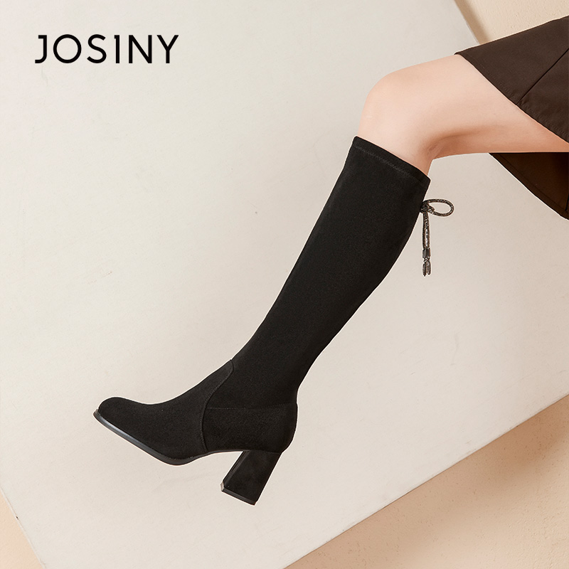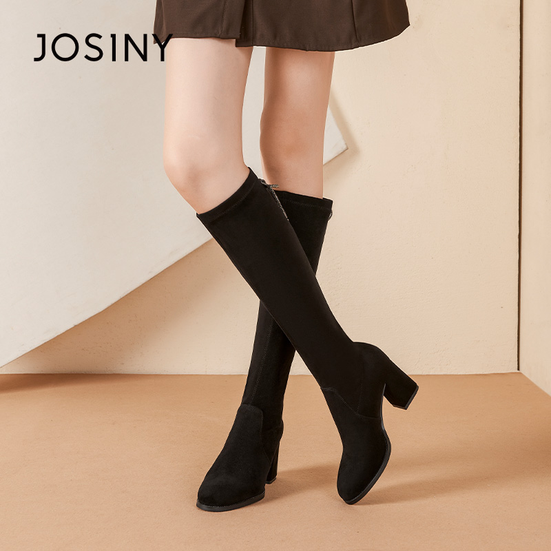卓诗尼女鞋粗跟圆头高筒靴百搭通勤气质绒面不过膝长靴弹力瘦瘦靴