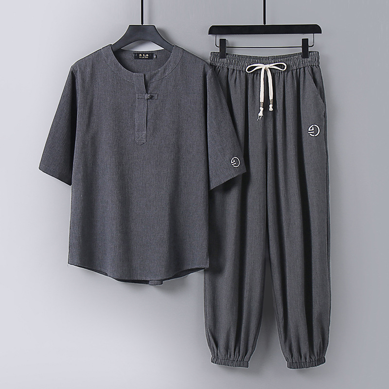 禅意棉麻短袖冰丝男士套装超薄v领改良汉服唐装宽松休闲居士服夏